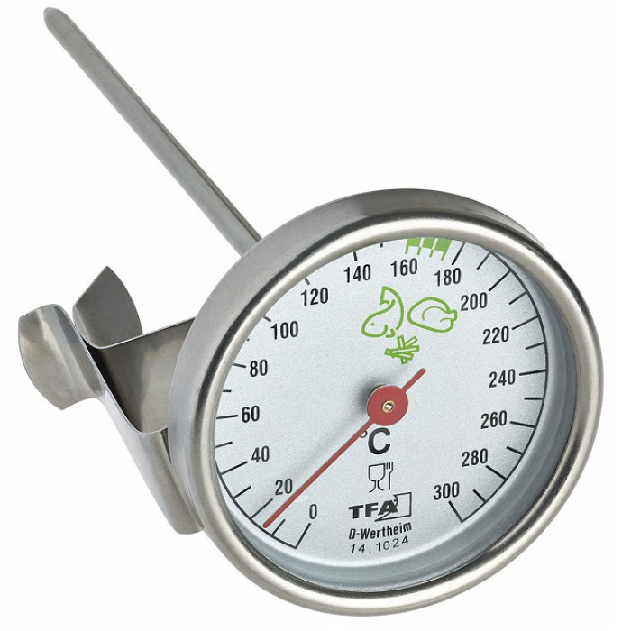 Особливості: Практичний кухонний інструмент для смаження у фритюрі Температура вимірюється за допомогою перевіреної біметалевої технології З маркуванням для ідеальної температури смаження жиру З високоякісної нержавіючої сталі З затискачем Зареєстрований дизайн TFA