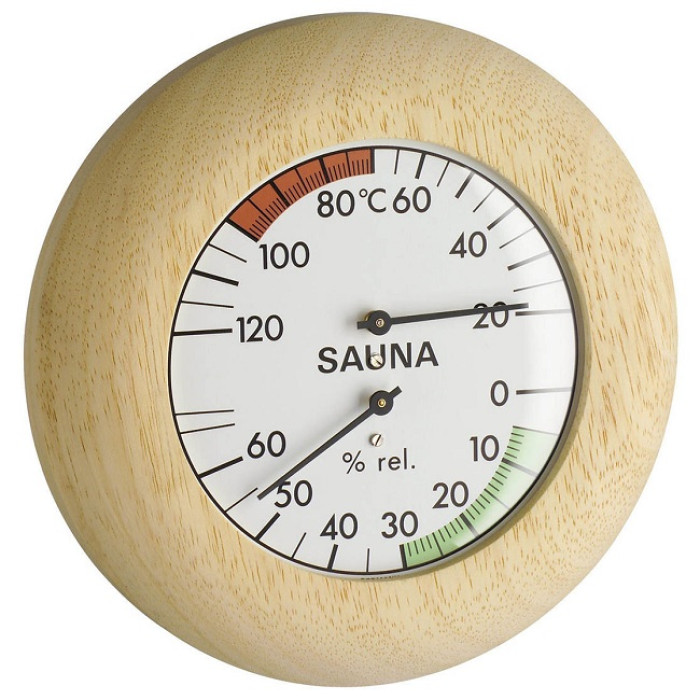 Сауна тримає вас у формі і здоровим, але тільки якщо все зроблено правильно. За допомогою цього комбінованого пристрою ви можете контролювати температуру і вологість у вашій сауні і, таким чином, забезпечувати максимально можливий комфорт. Оптимальний діапазон позначений кольором. Це дозволяє швидко побачити, чи підтримується правильний клімат в сауні. Термогігрометр має широкий каркас з дерев'яного масиву і повністю виготовлений в Німеччині. Температура вимірюється за допомогою перевіреної біметалевої технології. Гігрометр працює з синтетичним волосом і тому дуже точний.