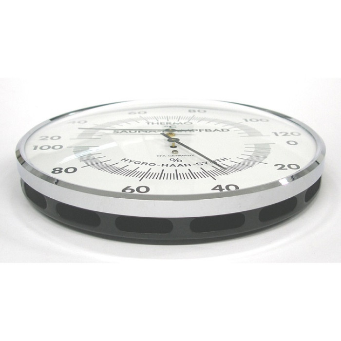 Сауна тримає вас у формі і здоровим, але тільки якщо все зроблено правильно. За допомогою цього комбінованого пристрою ви можете контролювати температуру і вологість у вашій сауні і, таким чином, забезпечувати максимально можливий комфорт. Термогігрометр з обідком з хромованої латуні повністю виготовлений в Німеччині. Температура вимірюється за допомогою перевіреної біметалевої технології. Гігрометр працює з використанням високоточного механізму з синтетичним волосом.