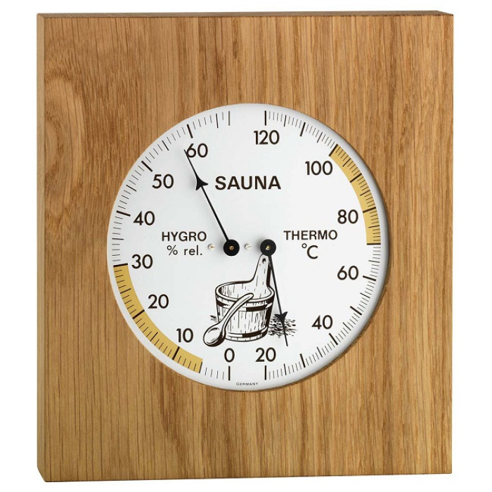 Сауна тримає вас у формі і здоровим, але тільки якщо все зроблено правильно. За допомогою цього комбінованого пристрою ви можете контролювати температуру і вологість у вашій сауні і, таким чином, забезпечувати максимально можливий комфорт. Оптимальна зона позначена кольором. Це дозволяє швидко побачити, чи підтримується в сауні правильний клімат. Завдяки змащеній поверхні структура дуба набуває контраст і глибину і виглядає особливо вишуканою. Термогігрометр повністю виготовлений в Німеччині. Температура вимірюється за допомогою перевіреної біметалевої технології. Гігрометр працює з використанням високоточного механізму з синтетичним волосом.