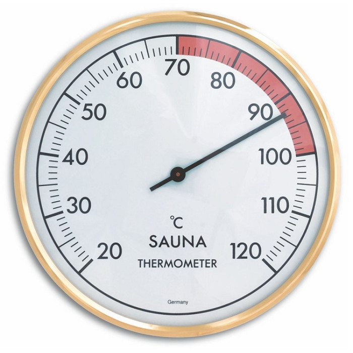 Сауна тримає вас у формі і здоровим, але тільки якщо все зроблено правильно. За допомогою цього термометра ви можете контролювати температуру у вашій сауні і, таким чином, забезпечувати максимально можливий комфорт. Велика шкала дуже добре читається, а оптимальний діапазон відзначений кольором. Це дозволяє швидко побачити, чи підтримується потрібна температура в сауні. Термометр з золотистим металевим обідком повністю виготовлений в Німеччині. Температура вимірюється за допомогою перевіреної біметалевої технології.