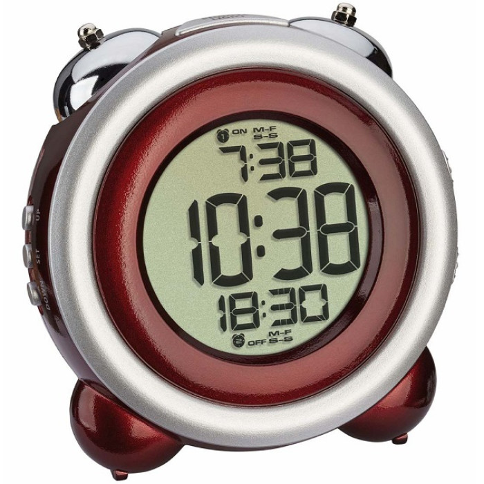 Особливості: Два окремих будильника з різними режимами (M-F, S-S: з понеділка по неділю, M-F: з понеділка по п'ятницю, S-S: субота і неділя) Формат часу 12/24 Функція відстрочки будильника Snooze Індикація дня тижня і дати Корпус дзвіночків виготовлений з металу Підсвічування Великі цифри Стильний сучасний дизайн Будильник дуже простий у використанні