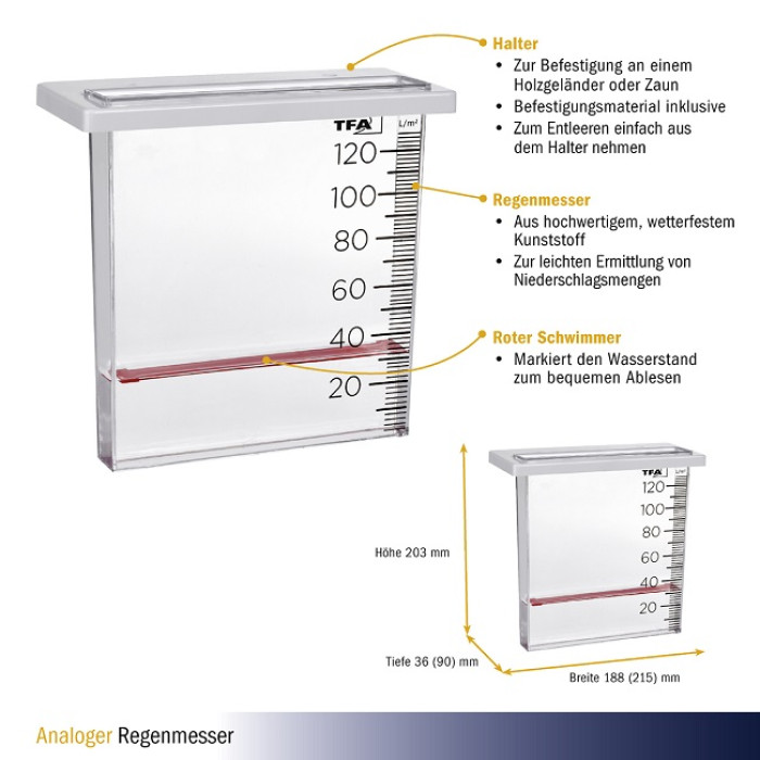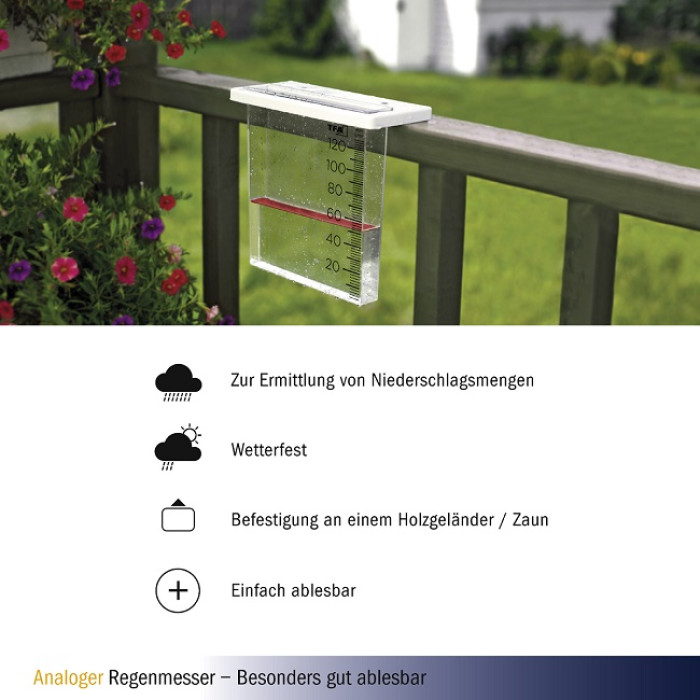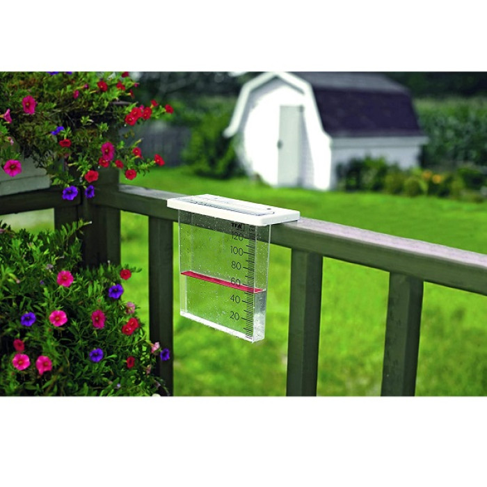 з високоякісного і стабільного пластика з вбудованим утримувачем для монтажу на дерев'яні перила або паркан. Для зручності перегляду показань