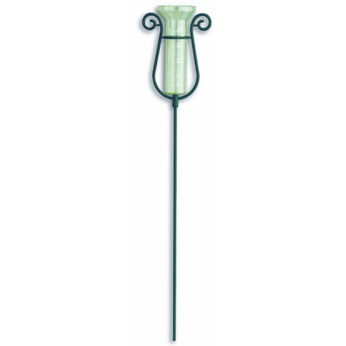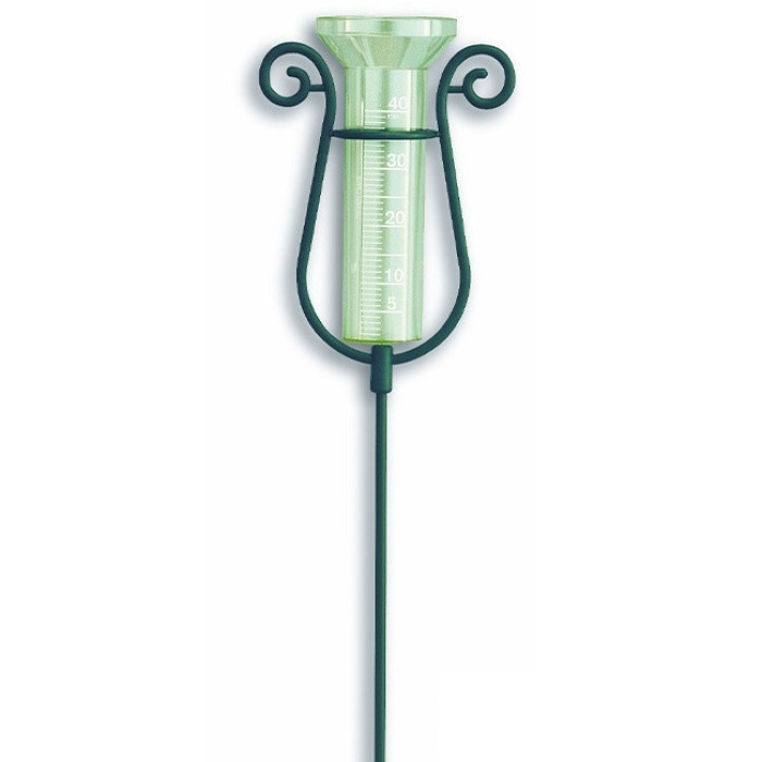 Класичний дощомір з атмосферостійкого, прозорого зеленого кольору пластику з декоративним стрижнем для легкого і точного визначення кількості опадів.