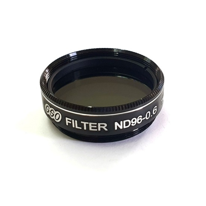 Сірий нейтральний фільтр GSO №ND96, 1.25'' використовується для спостережень Місяця і інших яскравих об'єктів. Дуже добре підвищує контраст деталей. Чим більше діаметр об'єктива телескопа, тим більш щільний фільтр рекомендується використовувати. Зберігає істинний колірний баланс об'єкта. Цей фільтр нейтральної щільності ND96 пропускає 25% видимого світла. Він поставляється зі стандартною 1.25" зовнішнім різьбленням (M28x0.6), тому його можна прикрутити практично до будь-якого астрономічного окуляра або аксесуару з 1.25" різьбленням. Він також має стандартну 1.25-дюймову внутрішню різьбу з іншого боку, тому його можна встановлювати з додатковими фільтрами.