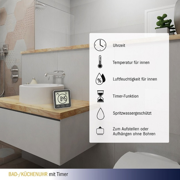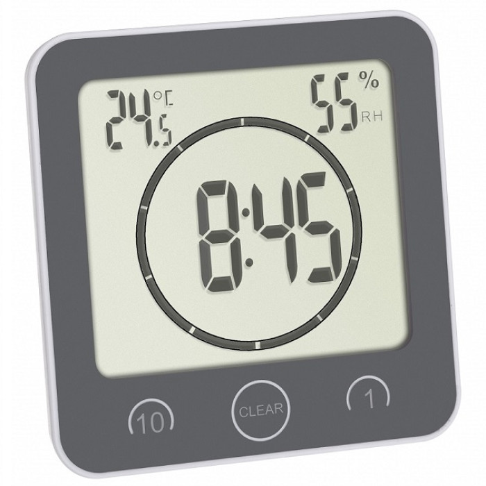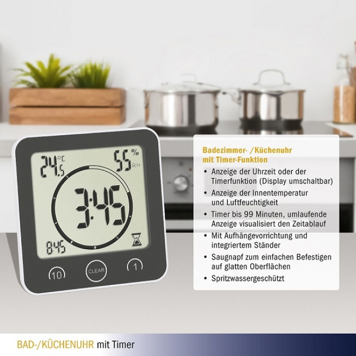 Коли справа доходить до ранкового душу чи приготування, кожна хвилина на рахунку. З цим годинником для ванної кімнати/кухні від TFA ви отримуєте не тільки поточний час, а й функцію таймера.