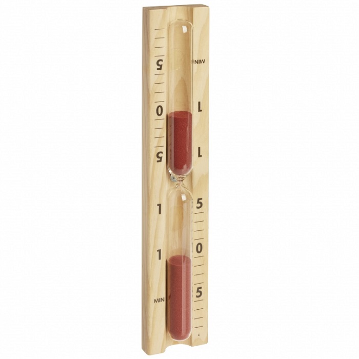 Цей таймер у вигляді пісочного годинника, виготовлений з масиву сосни, є класикою і не повинен бути відсутнім у жодній сауні. 15-хвилинна шкала відповідає максимально рекомендованій тривалості перебування в сауні та легко читається.