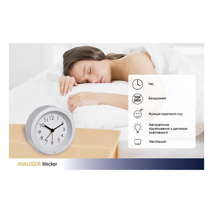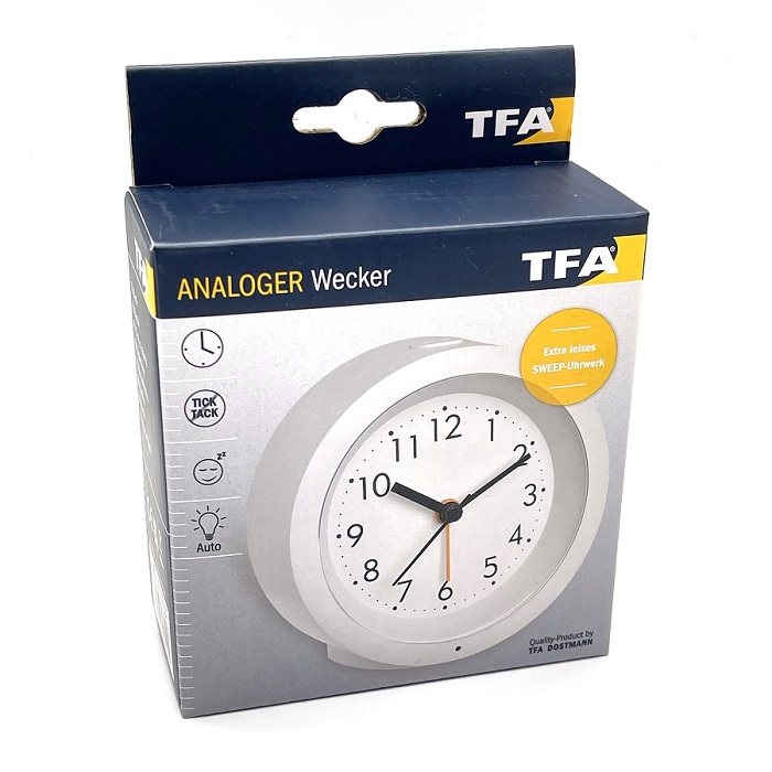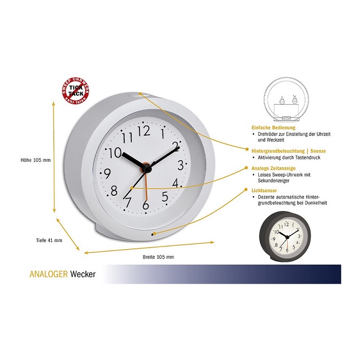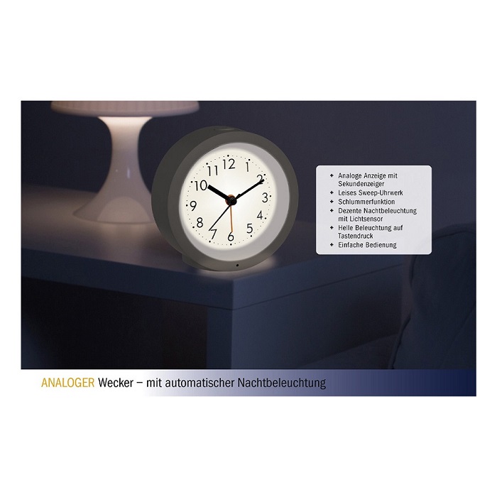З цим круглим будильником від TFA ви завжди бачитимете поточний час, навіть уночі. Як тільки датчик освітленості реєструє темряву, автоматично вмикається слабке підсвічування. Аналоговий циферблат може бути яскраво підсвічений одним натисканням кнопки. Безшумний рух стрілок не турбує ваш сон. Будильник допоможе вам вчасно підвестися з ліжка. А якщо ви не хочете відразу вставати, функція повтору дозволить вам прокинутися за кілька хвилин.