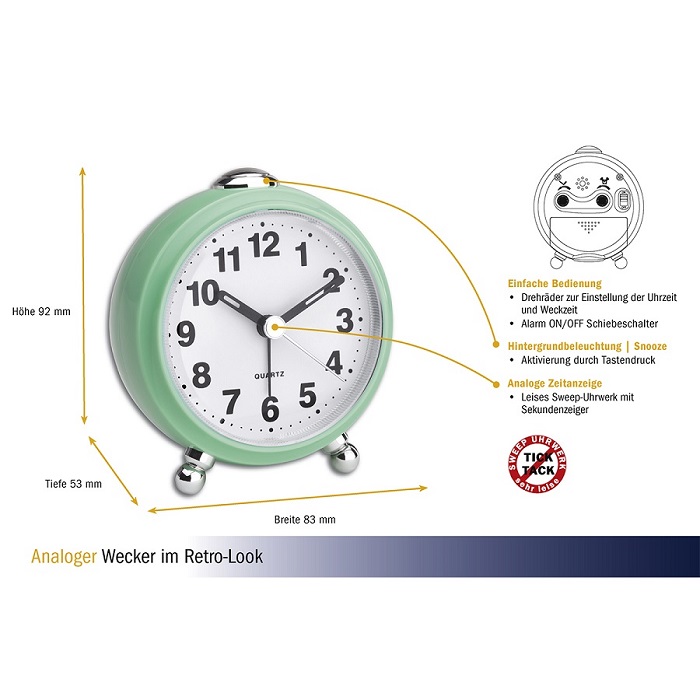 З цим будильником у стилі ретро ви завжди будете стежити за часом – навіть у темряві завдяки підсвічуванню. Його механізм працює особливо тихо, тому він не заважатиме вам спати. Функція відкладення дає вам ще кілька хвилин, щоб встати з ліжка вранці.