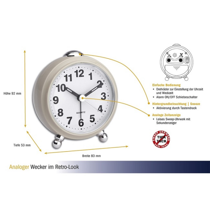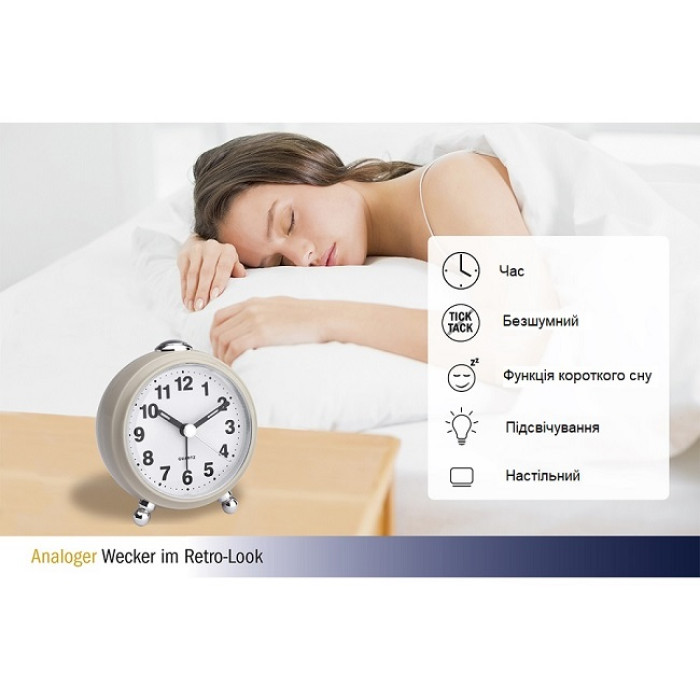 З цим будильником у стилі ретро ви завжди будете стежити за часом – навіть у темряві завдяки підсвічуванню. Його механізм працює особливо тихо, тому він не заважатиме вам