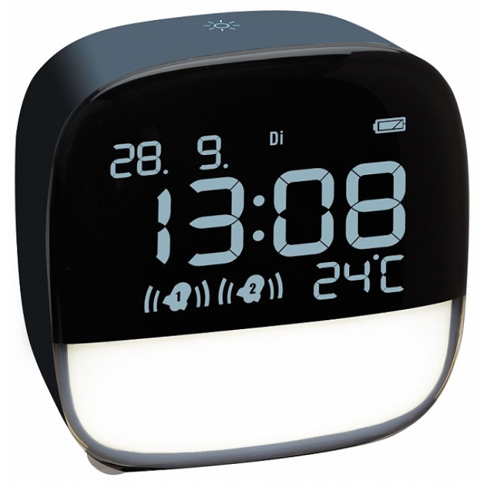 У центрі уваги великого дисплея, звичайно, час. Але ви також можете зручно читати дату та день тижня. Вбудований термометр вимірює температуру в приміщенні та забезпечує приємний клімат у спальні. Зрештою, легко спати у правильній атмосфері.