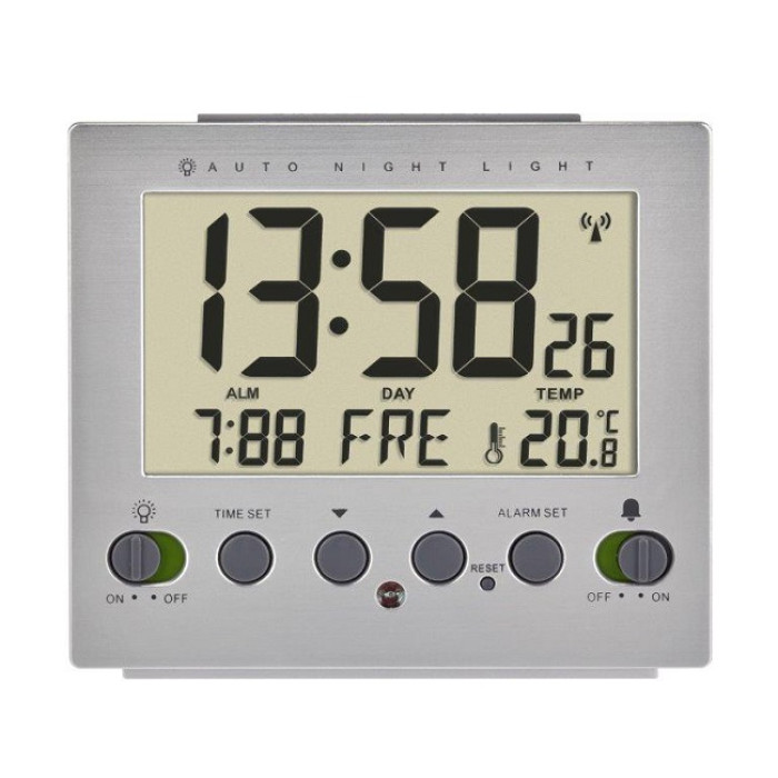 Цей радіокерований будильник у корпусі з привабливим алюмінієвим зовнішнім виглядом приймає сигнал часу DCF77 і автоматично синхронізується з високоточним атомним годинником недалеко від Франкфурта. Це означає, що ви завжди бачите поточний час і прокидаєтеся вчасно. Дата та день тижня також встановлюються автоматично.