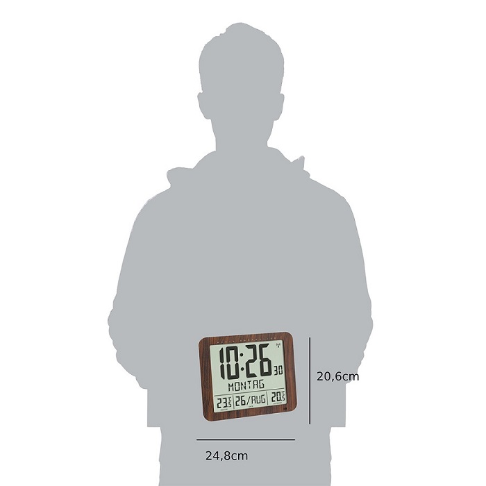 З цим радіокерованим годинником від TFA Dostmann ви завжди знатимете правильний час. Це пов’язано з тим, що час встановлюється з точністю до секунди за допомогою сигналу DCF77, а перехід із зимового на літній час відбувається автоматично. Цифровий дисплей великий і легко читається, ідеально підходить не тільки для дому, а й для офісу, залу очікування, передпокою чи приймальні.