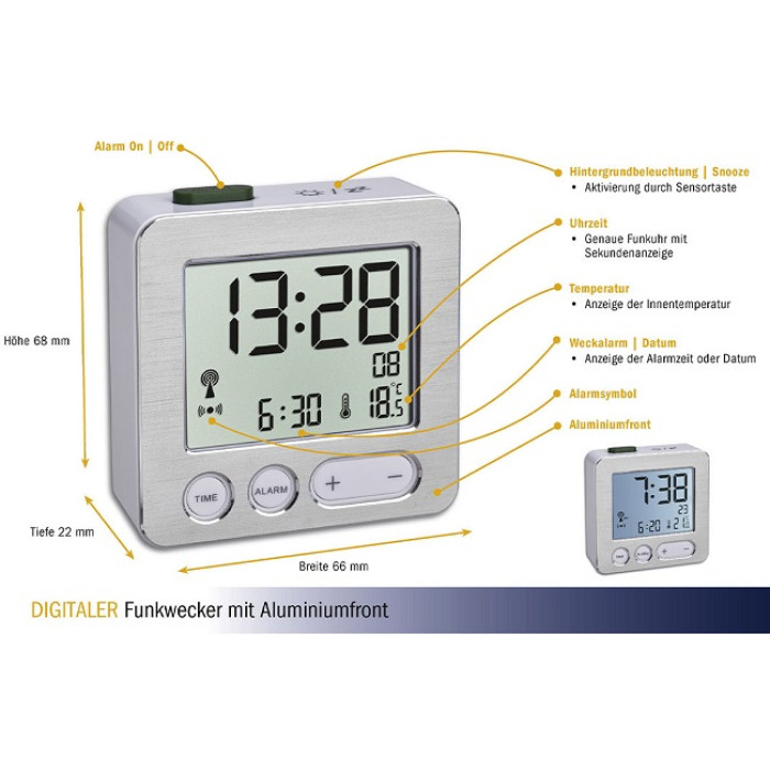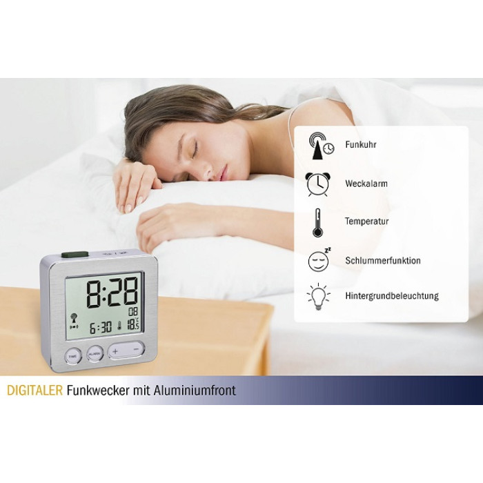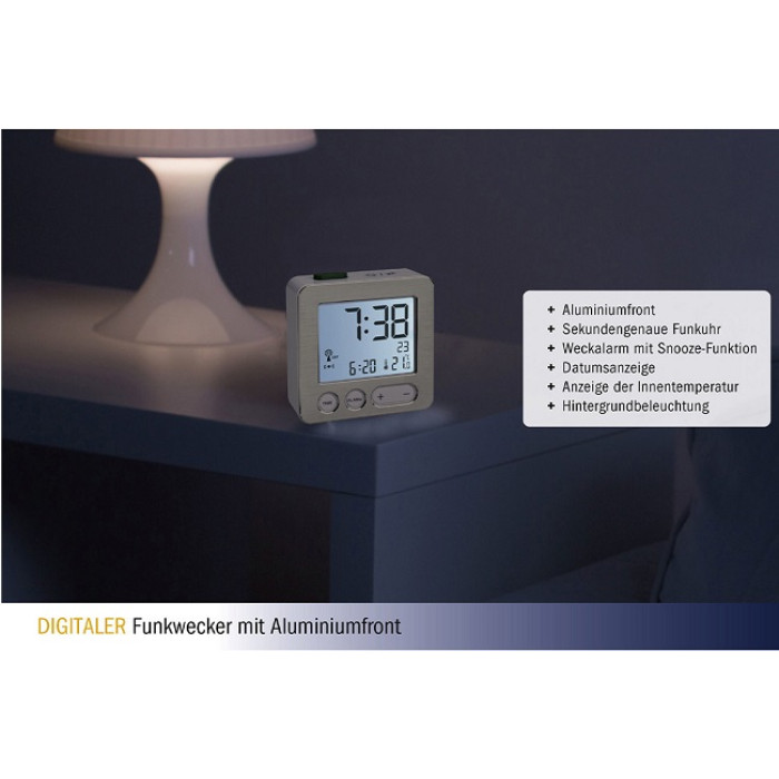Особливості: Індикація температури в приміщенні і дати Високоточний радіокерований годинник (DCF77 - сигнал) Будильник з функцією повтору Підсвічування активується натисканням сенсорної клавіші