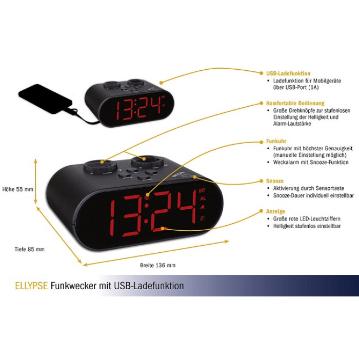 будильник ELLYPSE відображає час великими червоними світлодіодними