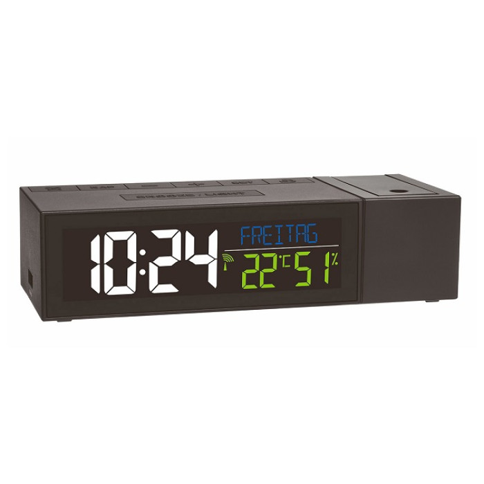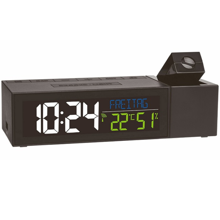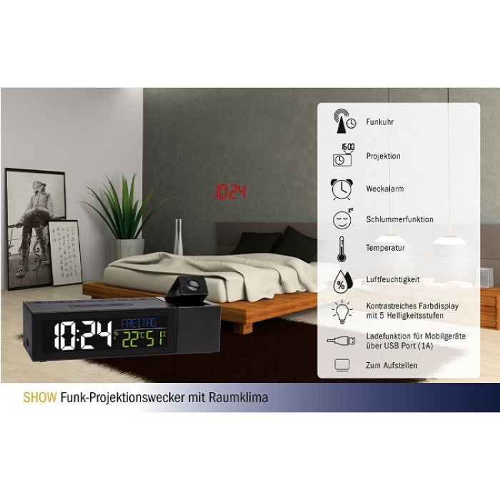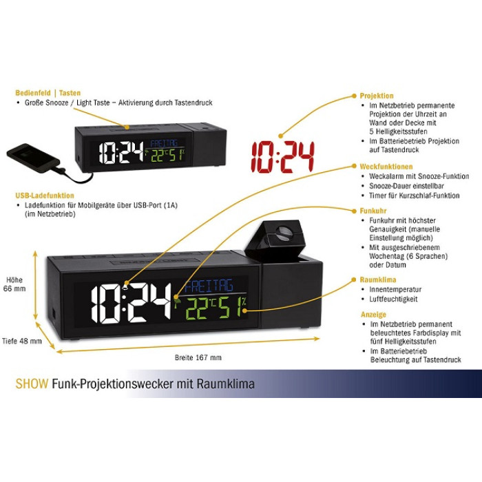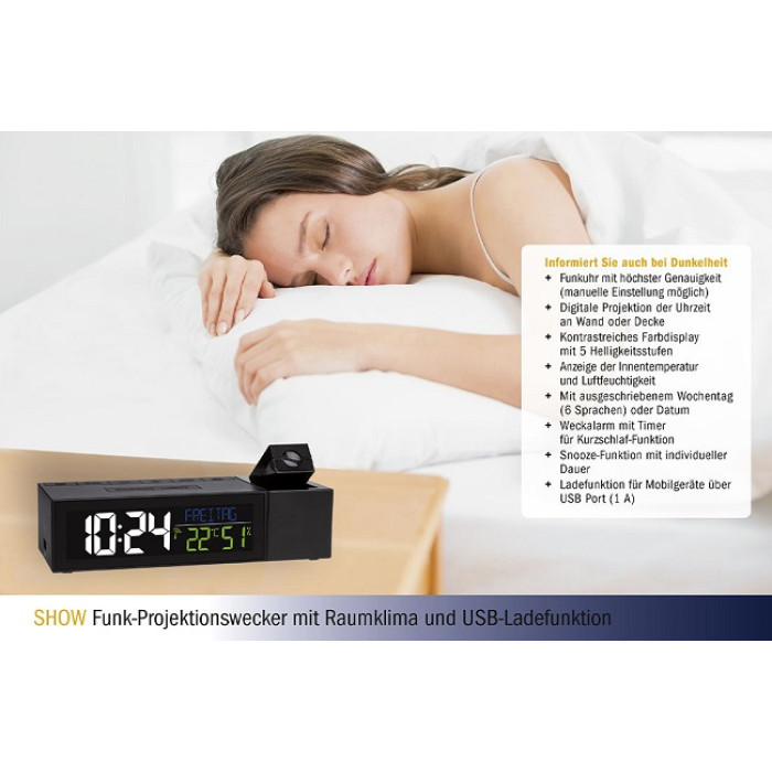 З керованим по радіо проекційним будильником «SHOW» вам більше ніколи не доведеться шукати потрібну кнопку вночі, так як радіокерований годинник проектує даний час на стіну або стелю вашої спальні. Кольоровий дисплей показує не тільки поточний час, але також повними буквами дату і день тижня, які ви можете вибрати між 6 мовами. Яскравість дисплея можна регулювати (5 рівнів). Крім того, відображаються температура і вологість у приміщенні, так що ви можете активно контролювати клімат в приміщенні з допомогою цільового опалення та вентиляції. Крім цих корисних спеціальних функцій, пристрій також виконує всі функції радіокерованого будильника: будильник вчасно вас будить, але завдяки функції повтору з регульованим інтервалом ви можете отримати додатковий сон ще на кілька хвилин. Вбудована функція таймера дрімоти надійно розбудить вас після короткого сну. Особливістю тут є вбудована функція зарядки для пристроїв з USB-портом.