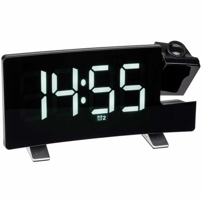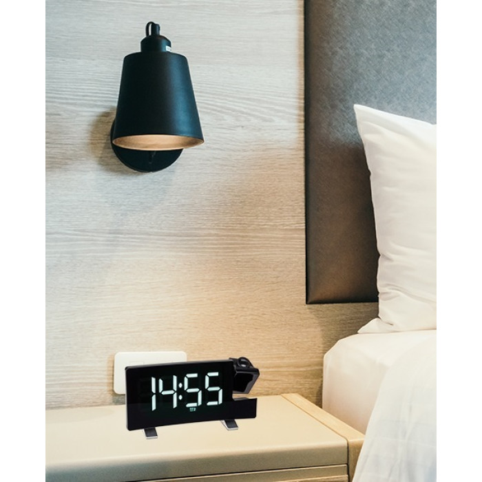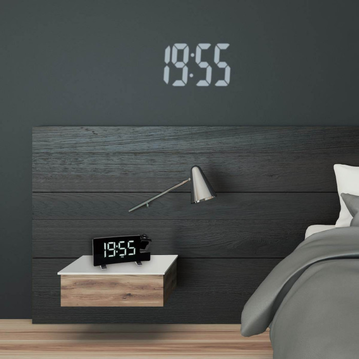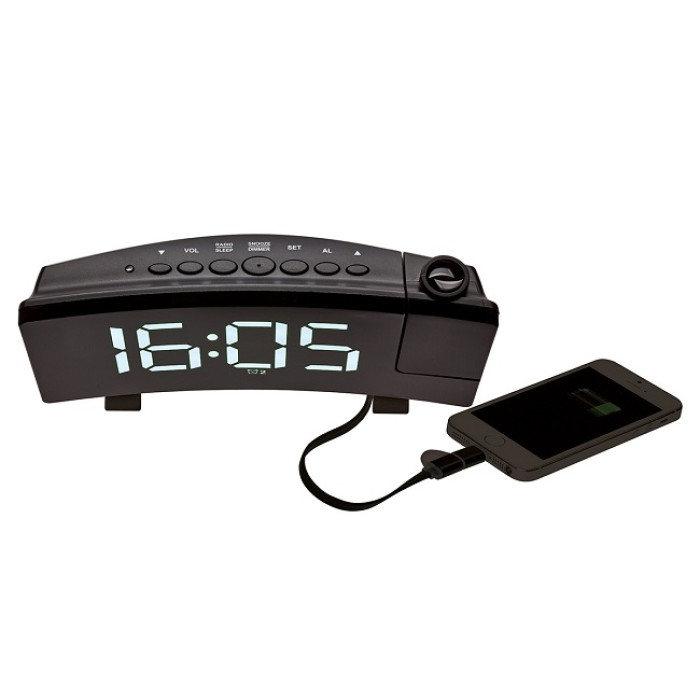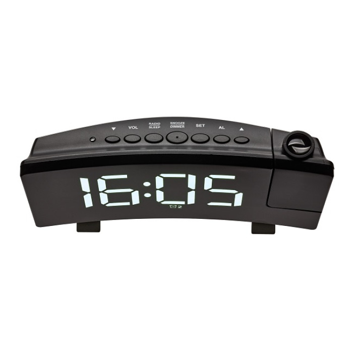 Для багатьох людей прокидатися під улюблену радіостанцію - кращий спосіб почати день в гарному настрої. А цей сучасний радіо-будильник незвичайної форми може запропонувати ще більше. Ви можете легко дізнатися час вночі, не повертаючи голову до будильника, тому що час проектується на стіну або стелю вашої спальні цифрами, що світяться (з можливістю регулювання 2 рівнями яскравості). Цифри часу також виглядають дуже великими і безрамковими на зігнутому дисплеї. Дисплей можна регулювати за трьома рівнями яскравості, автоматично зменшувати яскравість вночі за допомогою датчика освітленості або повністю вимикати.