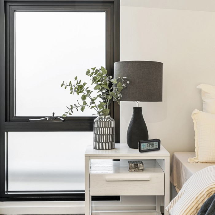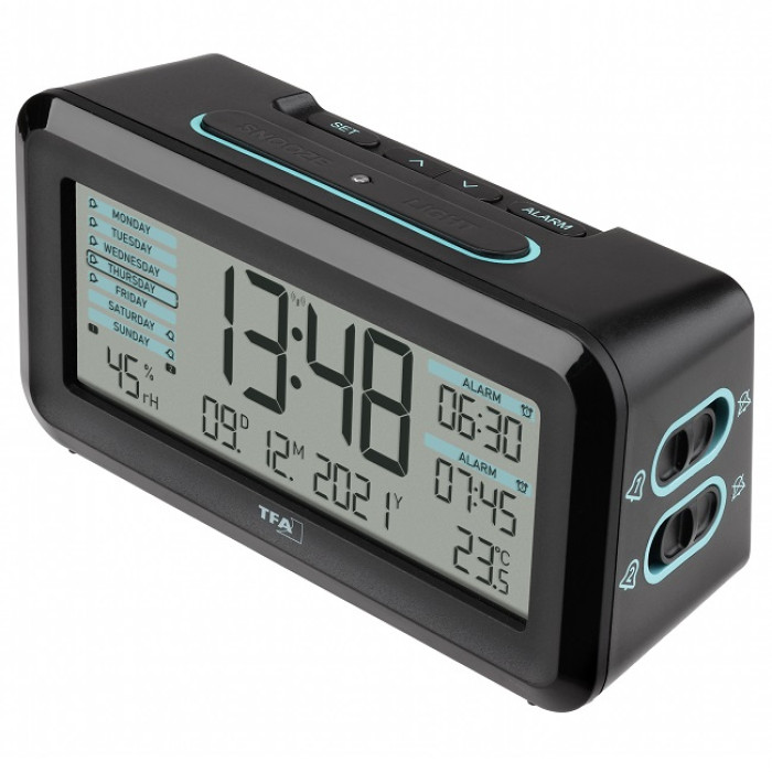 Будильник BOXX2 має дві вирішальні переваги, які відрізняють його від звичайних радіобудильників: для нього не потрібні одноразові батарейки, але вбудований акумулятор можна легко, економічно і нешкідливо для навколишнього середовища заряджати за допомогою кабелю micro-USB на ноутбуці, ПК, зовнішньому акумуляторі так само, як ваш смартфон. Це дозволяє легко налаштувати BOXX2 без розеток. Другою особливістю є можливість встановити час пробудження кожного дня тижня. Доступні два часи будильника, і ви можете вибрати для кожного дня, чи будильник має дзвонити один або обидва рази. А якщо ви не хочете одразу вставати, функція повтору подарує вам кілька додаткових хвилин у ліжку. Тривалість повтору може бути встановлена на 5, 10 або 15 хвилин. Радіокерований годинник отримує час за сигналом DCF-77. Це означає, що ви завжди отримуєте поточний час із точністю до секунди і без необхідності встановлювати його заздалегідь. Відображається дата, а сьогоднішній день тижня виділяється кольором. Відображення можна налаштувати, якщо перегляд секунд або календарного тижня для вас цікавіший, ніж відображення року. Індикація температури та вологості допомагає регулювати мікроклімат у спальні. Для спокійного сну температура має бути не вище 18°С, але й не нижче 16°С. Оптимальний діапазон вологості повітря – від 40 до 60%. Щоб ви могли легко читати показання дисплея вночі, будильник має непомітне та економічне світлодіодне підсвічування, яке може автоматично вмикатися в темряві за допомогою датчика освітлення.