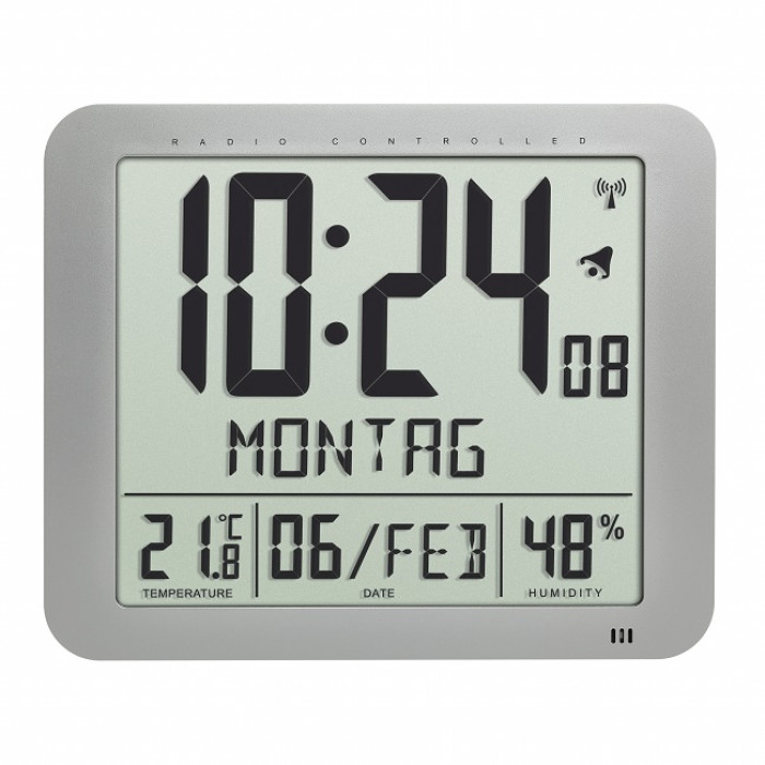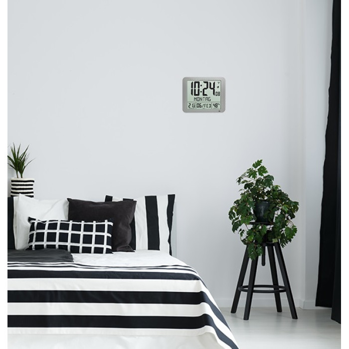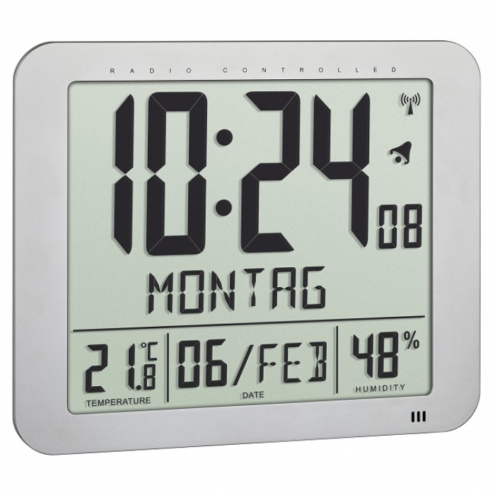 Цей радіокерований годинник від TFA вражає своїм чітким впорядкованим дисплеєм. Дисплей також легко читається на відстані і особливо підходить для зони входу або приймальні, кімнати очікування та офісу. На додаток до дати з повним днем тижня також відображаються температура та вологість у приміщенні. Таким чином, ви можете забезпечити приємний клімат у ваших житлових та робочих приміщеннях. Час встановлюється з точністю до секунди за допомогою сигналу DCF77, і перехід із зимового на літній час також відбувається автоматично. Простий і зрозумілий дизайн цього радіокерованого годинника підходить для будь-якої обстановки, незалежно від того, чи ви надаєте перевагу настінній установці годинника або на горизонтальній поверхні.