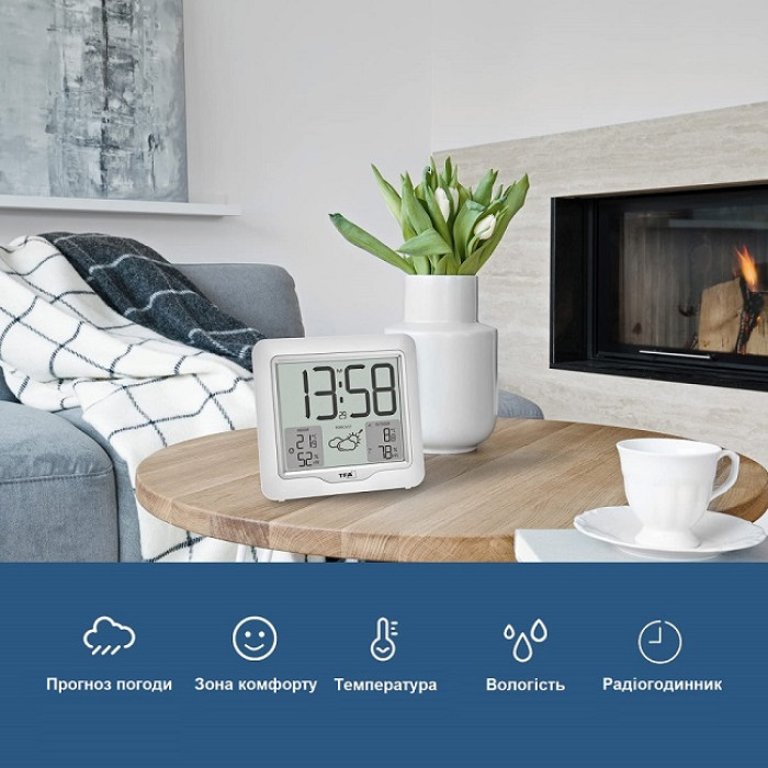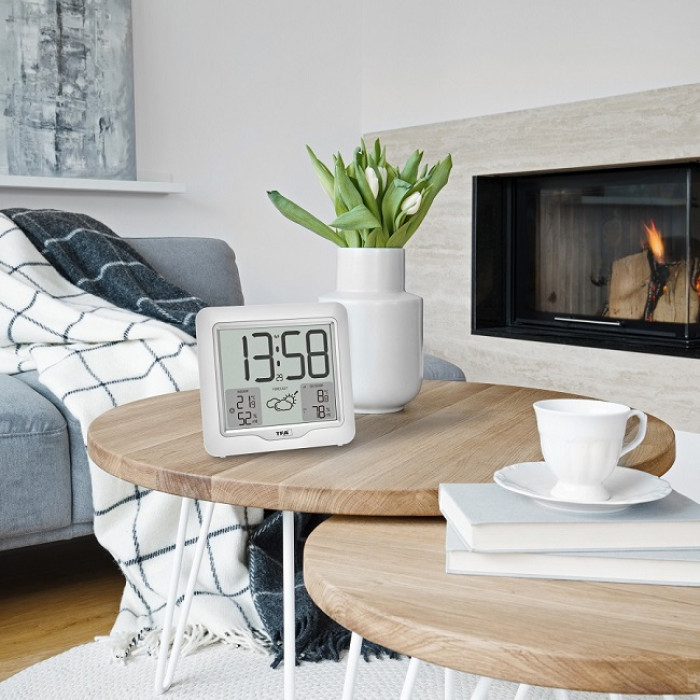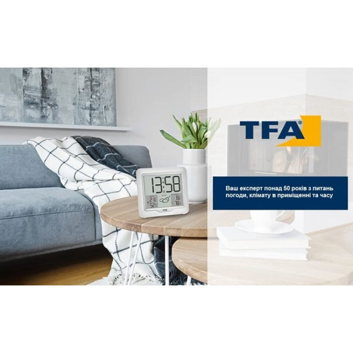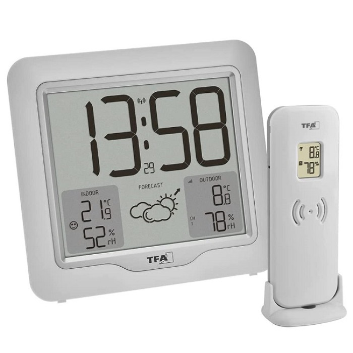 Ця сучасна метеостанція у біло-сріблястому корпусі, до речі, розроблена та спроектована TFA Dostmann, підходить для будь-якої вітальні. Її можна встановити або закріпити на стіні для економії місця. Її бездротовий зовнішній передавач надає точні дані про вологість і температуру зовнішнього повітря на відстані до 100 метрів і встановлюється на відкритому повітрі.