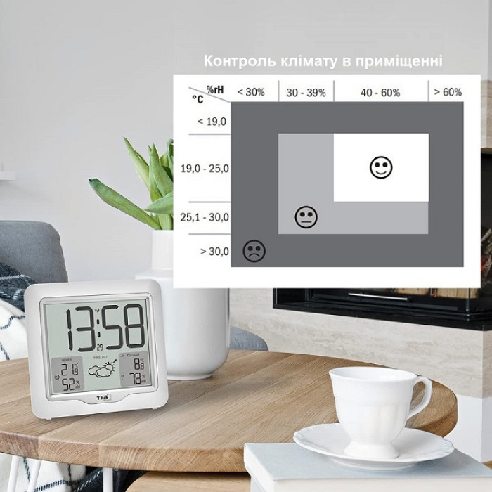 Ви також можете побачити температуру та вологість всередині та зовні приміщення. Усі важливі дані відразу видно. Ще одна корисна функція: станція показує рівень комфорту вашого внутрішнього клімату за допомогою смайлика.