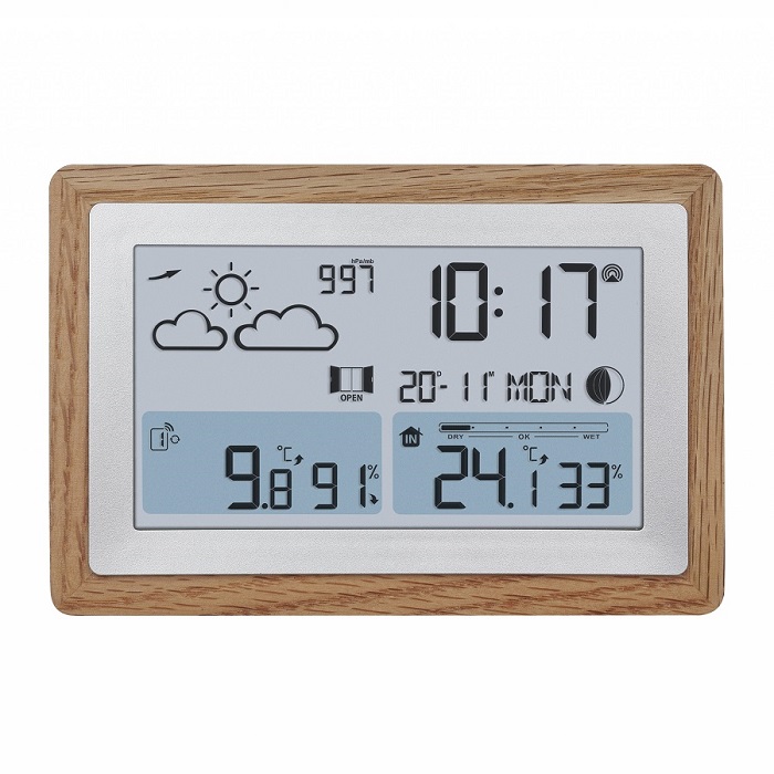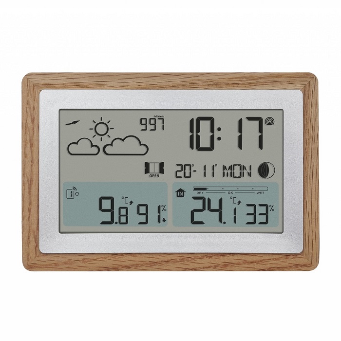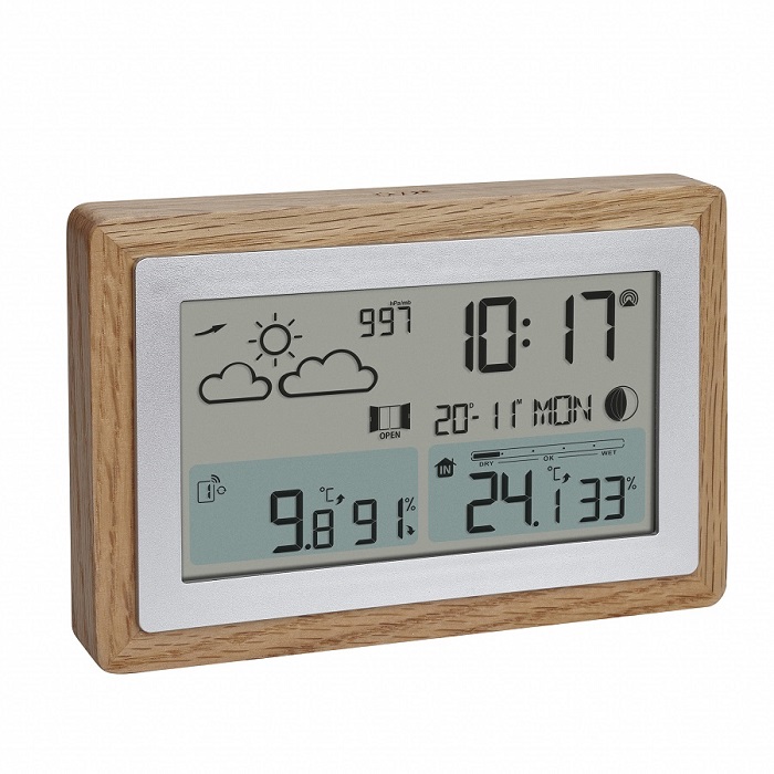 Безпровідна метеостанція OAK - ідеальне поєднання для тих, хто хоче отримувати багато інформації одночасно. Розмістіть безпровідну метеостанцію OAK на видному місці у вашому домі. Рамка з натурального дуба дозволяє легко інтегрувати пристрій у затишне житлове середовище. Зовнішні дані надходять по радіосигналу від безпровідного передавача (можливе підключення до 3 передавачів). Необхідне живлення забезпечується за допомогою мережевого адаптера.
