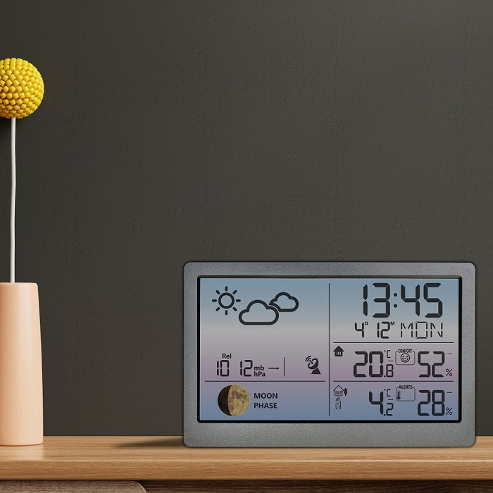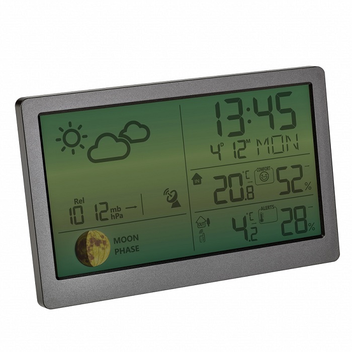Метеостанція LUNA SKY покаже вам все, що потрібно знати про погоду. Особливість: чітко впорядкована інформація про погоду з'являється на тлі м'яких синьо-жовто-фіолетових тонів, що нагадують сутінки, які підсвічуються одним натисканням кнопки. Місяць при цьому також сяє золотисто-жовтим кольором з деталями поверхні і вказує на фазу, в якій ми можемо бачити його на небі в даний момент.