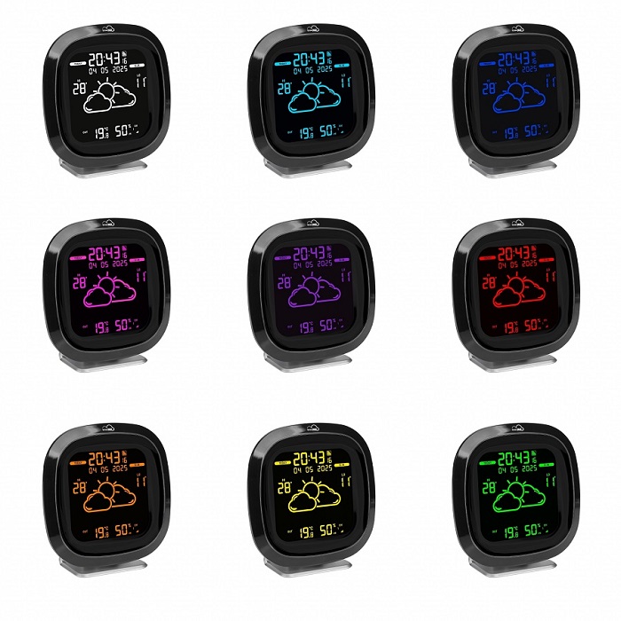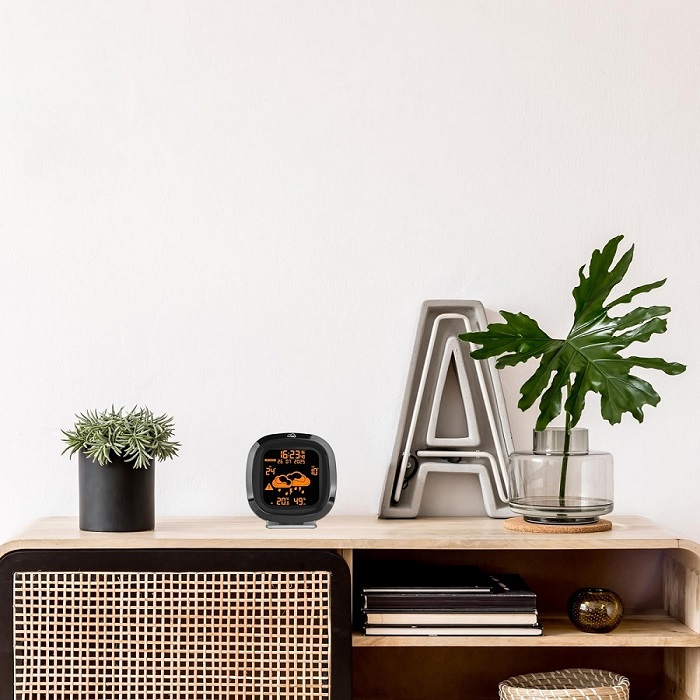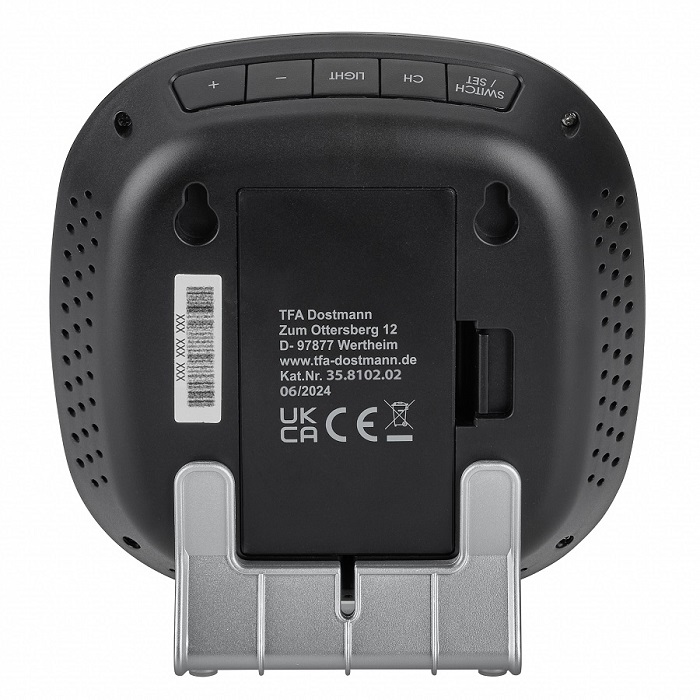 Живлення станції здійснюється за допомогою кабелю живлення, що входить до комплекту поставки. Крім того, три стандартні батарейки типу АА (не входять до комплекту) можна використовувати як резервне джерело живлення - наприклад, у разі відключення електроенергії або переміщення пристрою. Поточний час у вибраному місці безперервно відображається, за бажанням разом з повною датою або днем тижня (доступно шістьма мовами). Ви можете встановити станцію або закріпити її на стіні, де її буде добре видно.