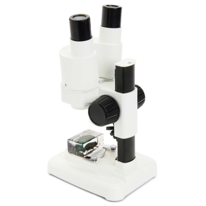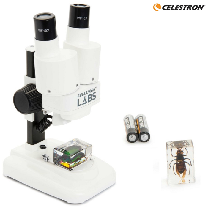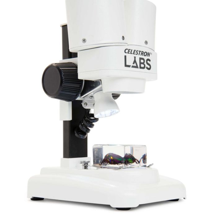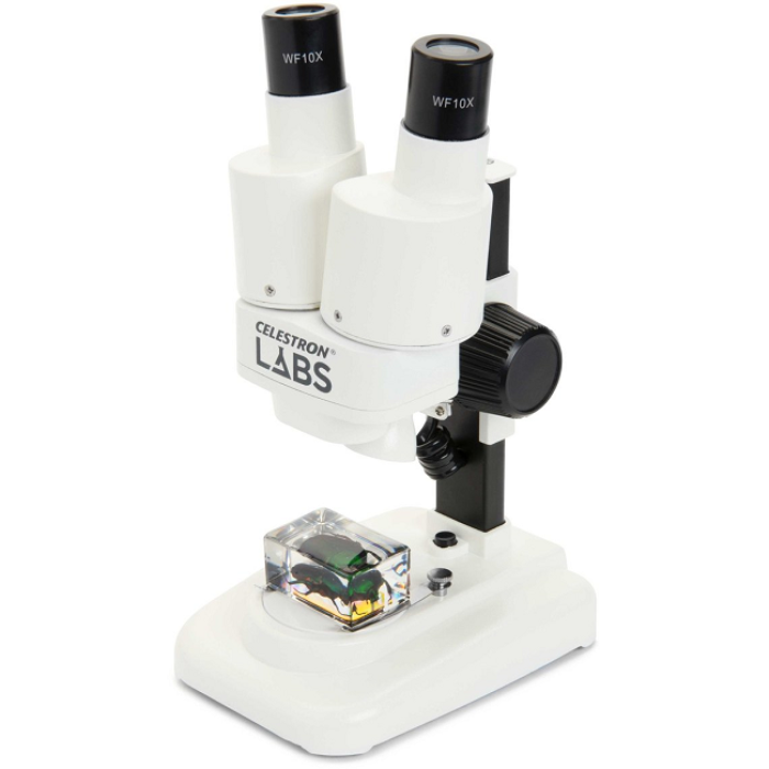 Celestron Labs S20 - стереомікроскоп з вбудованим верхнім світлодіодним освітлювачем. Мікроскоп створює не плоске, а тривимірне зображення. Завдяки 20x збільшенню він добре підходить для перегляду об'ємних деталей, таких як монети, листя, комахи, мінерали та інших середніх і великих об'єктів. Два ширококутних окуляри (10x) і 2 ахроматичних об'єктиви дозволяють отримати збільшення 20х. При необхідності можна підключити цифрову камеру для мікроскопа, для виведення і захоплення відео зображення.
