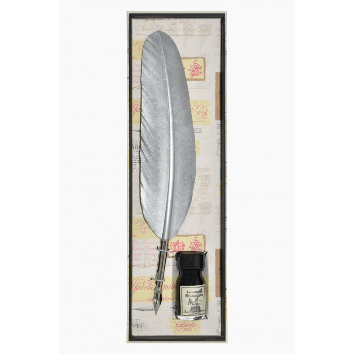 Комплект постачанняНатуральне гусяче перо розміром 17 (± 2) см;Мельхіорове перо, витримане в строгому стилі (6 см);Чорнило (20 ml) чорне;