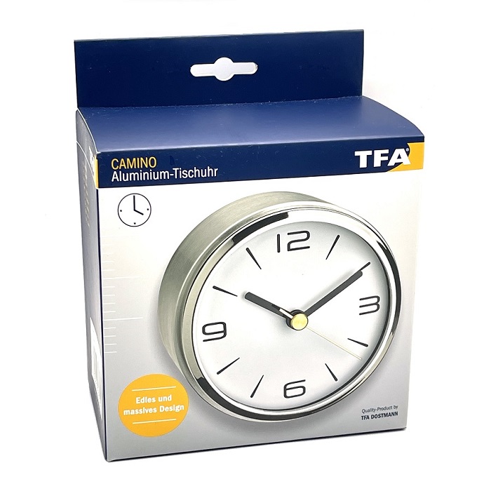 Камін або дров'яна піч випромінюють тепло та затишок і є типовим центром уваги у вітальні. Той, хто має вдома такий камін, може вважати себе щасливчиком. Бажаєте прикрасити камінну полицю красивими аксесуарами? CAMINO чудово підходить як стильний камінний годинник, за допомогою якого ви зможете стежити за часом. Завдяки міцному каркасу з полірованого алюмінію та елегантному, позачасовому дизайну CAMINO також добре виглядають на серванті, письмовому столі, комоді або на полиці. Настільний годинник міцно і надійно стоїть завдяки повстяній підкладці на нижній стороні.