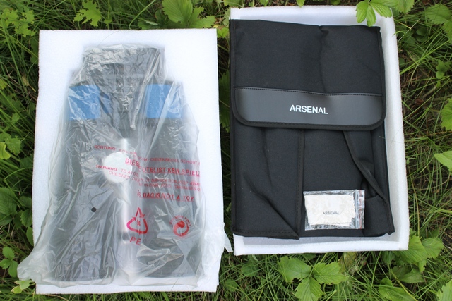 Внутреннее пространство коробки полностью заполнено блоками из пенополиуретана, которые образуют ложе для находящегося внутри бинокля. Там же внутри находится мягкий кофр для хранения и переноски.