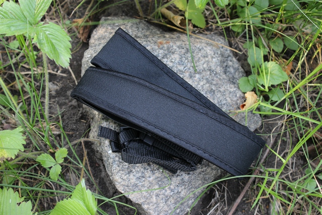 Шейный нейлоновый ремень широкий (42 мм) и мягкий, он достаточно комфортен для такого габаритного и тяжелого бинокля. Крепится ремешок к специальным проушинам, расположенным снизу призменных блоков бинокля.