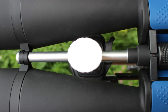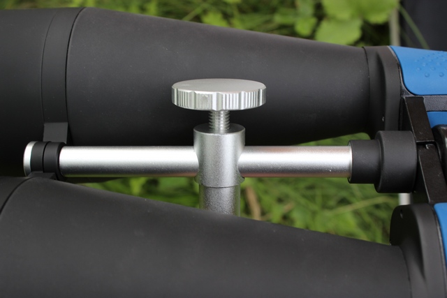 Мощная центральная балка бинокля (диаметром 15 мм) служит креплением для стойки фиксации прибора на фотоштативе. Максимальная длина отрезка перемещения стойки вдоль балки - 125 мм. Центр тяжести прибора находится практически точно посередине отрезка перемещения штативной стойки бинокля.
