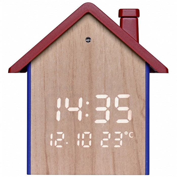 Откройте для себя наш очаровательный будильник в прекрасном дизайне домика с эффектом дерева — оригинальный и в то же время функциональный декоративный предмет для вашей спальни или детской комнаты. Его скрытый дисплей отображает время, дату и комнатную температуру прозрачными светодиодными цифрами с подсветкой. Яркость можно регулировать в семи уровнях. Его функция автоматического затемнения гарантирует, что дисплей будет ярким днем и приятно мягким ночью.