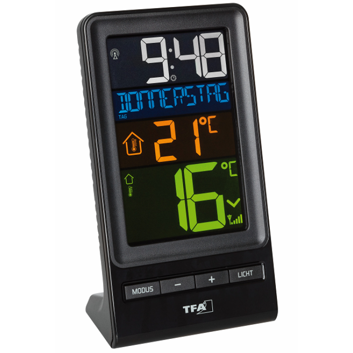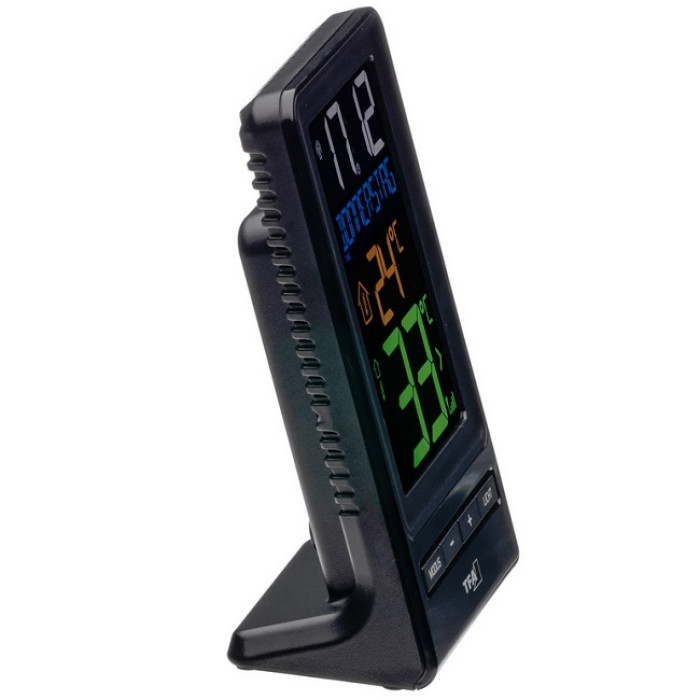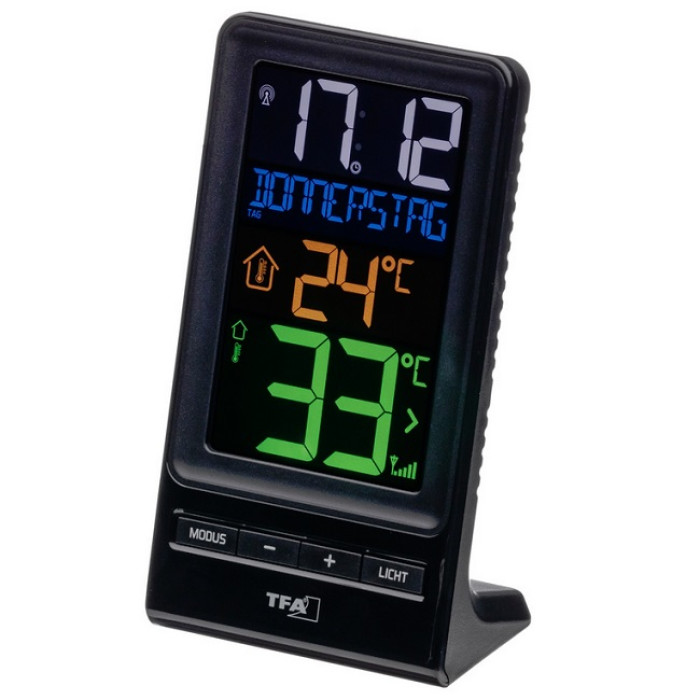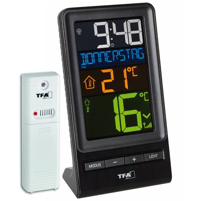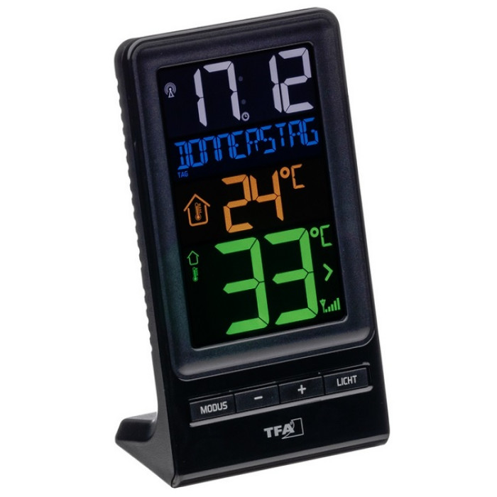 Температура наружного воздуха на месте определяется отдельным беспроводным передатчиком и отображается стрелка тенденции изменения на цветном дисплее; внутренний датчик измеряет температуру в помещении.