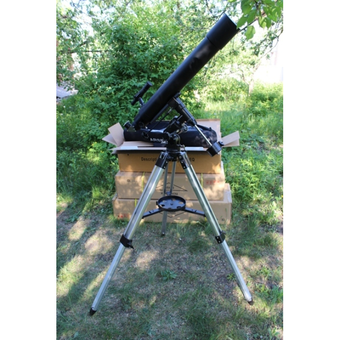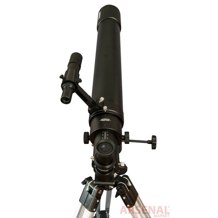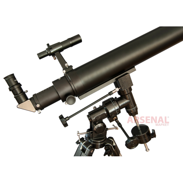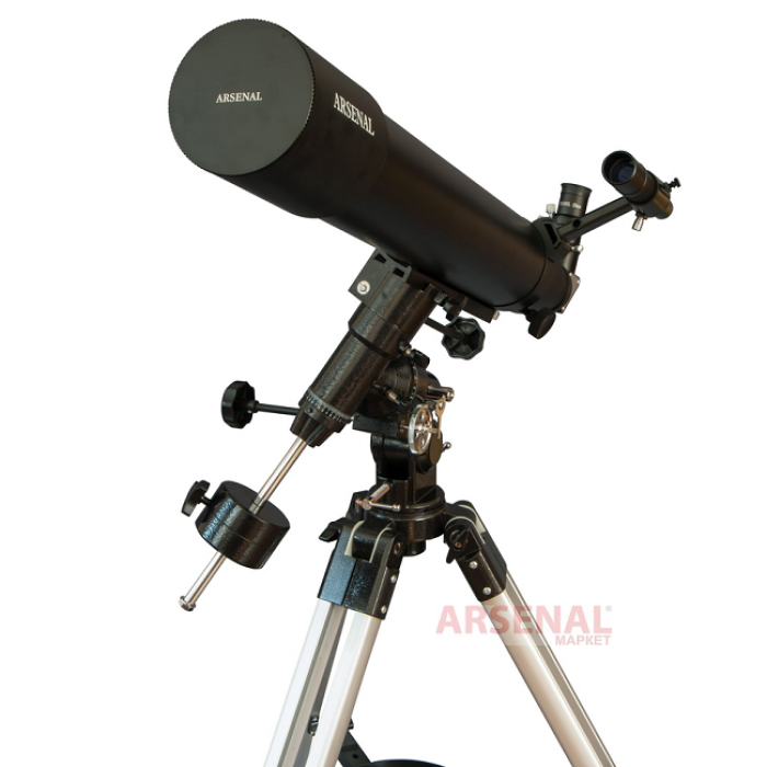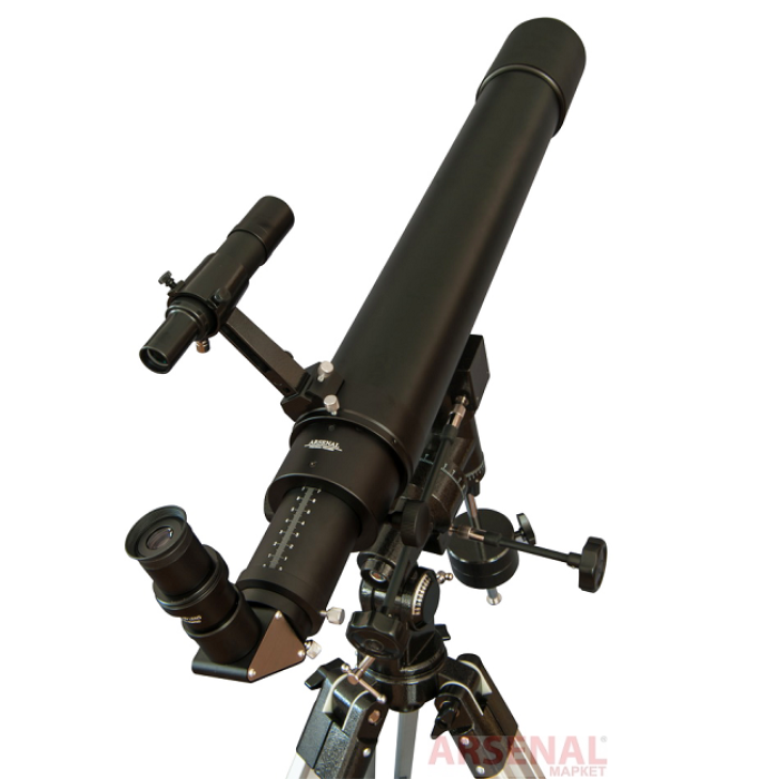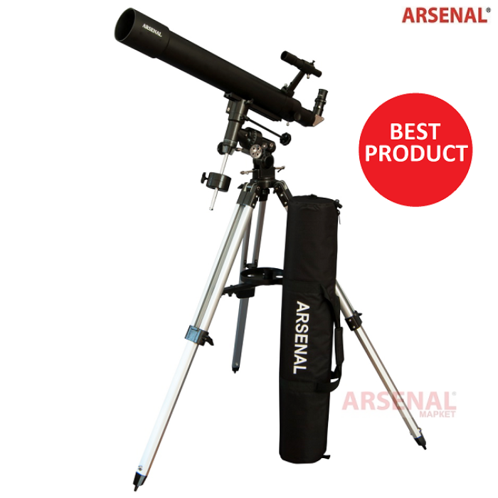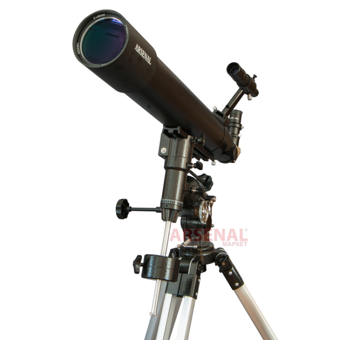 Телескоп Arsenal 908EQ3 - високоякісний рефрактор, що підходить як для земних, так і небесних спостережень. Модель здатна забезпечити чітке зображення Місяця і планет, супутників Юпітера і кілець Сатурна. Телескоп оснащений тільки скляними оптичними елементами, а також алюмінієвим штативом. Arsenal 90/800 EQ3 забезпечений оптикою зі спеціальним багатошаровим просвітленням для отримання поліпшеної контрастності і чіткості зображень. Корпус оптичної труби забарвлений чорним матовим кольором і виконаний з алюмінію. У телескопі використовується високоякісний одношвидкісний фокусёр Крейфорда, який має більш плавний рух, не залишає подряпини на окулярах завдяки використанню компресійного латунного кільця. Фокусер забезпечений перехідником з 2 "на 1,25". Для зберігання і транспортування в комплект входить м'яка чорна сумка з ременем. Телескоп Arsenal 908EQ3 - в своєму роді унікальна пропозиція для вітчизняного ринку. Навіть з урахуванням дрібних недоліків, якість виконання і комплектація ставить його на голову вище аналогічних телескопів від інших виробників. А враховуючи ще й цілком демократичну вартість, даний телескоп цілком можна віднести до категорії «Best Product». Завдяки цьому телескопу Ви з комфортом зможете спостерігати безліч різноманітних небесних об'єктів. Ви зможете побачити деталі в кратерах Місяця і її гірських масивах, грануляцію і плями на Сонці (застосування захисного фільтра - ОБОВ'ЯЗКОВЕ), хмарні пояси на диску Юпітера і великі деталі в них, чотири його найбільших (галілеєвих) супутники, фази Венери і Меркурія, щілину Кассіні в кільці Сатурна, його супутник Титан, компоненти багатьох подвійних зірок, полярні шапки Марса в епохи його протистоянь, планети Уран і Нептун. Останні, щоправда, буде видно як зірки. Також Ви познайомитеся з глибоким космосом, тому що цьому телескопу вже цілком доступна велика частина об'єктів знаменитого каталогу Мес'є.
