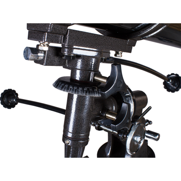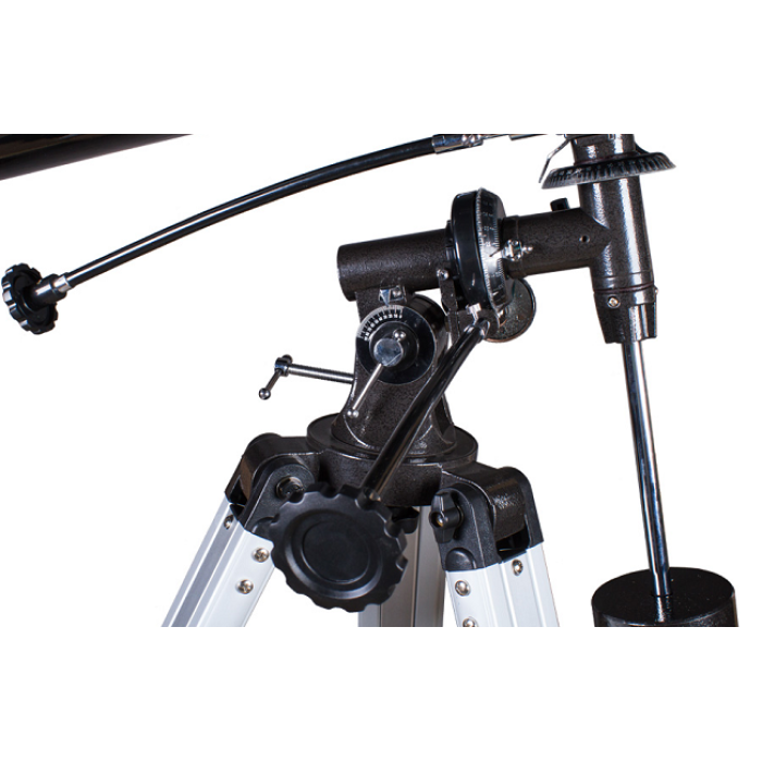 Пакування телескопу просту і функціональну, нічого зайвого. Загальна вага постачання приблизно 20 кг. Сам же телескоп у зібраному стані важить близько 13 кг. Складання телескопу просте і не займає багато часу. Приємно, що виробник подбав про свого споживача і включив в комплектацію телескопа повний набір необхідного для його складання і налаштування інструменту. Штатив алюмінієвий, двосекційний, досить міцний і стійкий для того, щоб нести на собі екваторіальне монтування EQ2. На внутрішні пластикові розпірки ніг штативу встановлюється трикутний металевий лоток для аксесуарів, що надає додаткову жорсткість всій конструкції. Монтування телескопа німецького типу, воно оснащене механізмами тонких рухів і координатними колами. Кріпиться воно до майданчика штативу за допомогою спеціального кріпильного гвинта, розташованого знизу. Відзначимо, що можлива автоматизація стеження за небесними об'єктами шляхом встановлення двигуна на екваторіальну вісь монтування. Для кріплення труби служать спеціальні кільця (хомути), які прикручуються до посадкової планки на монтуванні. У цих кільцях труба може вільно обертатися і переміщатися уздовж осі, що дозволяє досить точно її збалансувати і встановити таким чином, щоб окулярний вузол знаходився в зручному для спостерігача положенні. Зверху на одному з кілець є гвинт для встановлення фото-відеокамери. Фокусер пластиковий, рейковий, посадкова втулка для окулярів стандарту 1,25" виточена з металу і має різьблення для установки Т-адаптера на байонет дзеркальних фотокамер. Хід фокусера 50 мм. Достатню плавність його ходу забезпечують спеціальні фторопластові вставки всередині його корпусу. Потрібно, однак, пам'ятати, що важкі фотокамери можуть надмірно перевантажувати даний вузол, та й виносу фокусу може не завжди вистачатиме для наведення камери на різкість.