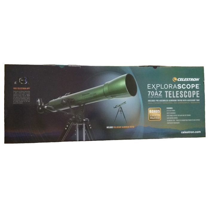 Телескоп Celestron Explorascope 70AZ - це альт-азимутальний телескоп-рефрактор, що ідеально підходить для огляду небесних і наземних об'єктів під час подорожей. Explorascope 70 може переглядати планети, Місяць, зоряні скупчення і більш яскраві об'єкти зоряного неба, такі як туманність Оріона і галактика Андромеди. Налаштування телескопу дуже просте і не викличе труднощів навіть у новачка. Навіть в перший раз ви можете зібрати телескоп і його аксесуари усього за кілька хвилин. Загальний набір телескопу важить усього 2,77 кг - ідеально підходить для імпровізованих сеансів спостереження або транспортування туди, куди вас ведуть життєві пригоди.
