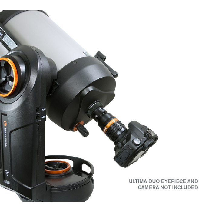 Додаток Celestron® SkyPortal ™ - ваш персональний гід зоряним небом. Телескоп Celestron NexStar Evolution - інструмент для ваших персональних відкриттів. Спільне використання додатка Celestron® SkyPortal ™ і телескопа Celestron NexStar Evolution дозволить навести телескоп на будь-який об'єкт з бази даних і розглянути його при великому збільшенні. Інженери Celestron втілили в серію телескопів NexStar Evolution всі побажання клієнтів. Нові конструктивні особливості забезпечать вам найкращий комфорт і зручність для спостережень. Забудьте про батареї або зовнішні джерела живлення. Вперше в історії на споживчому ринку телескоп з власним вбудованим акумулятором. З новим літій-фосфатним акумулятором ви зможете насолоджуватися спостереженням до 10 годин від одного заряду. Ви навіть можете заряджати свій телефон або планшет від USB порту вбудованого в телескоп NexStar Evolution. Інтелектуальна система управління живленням телескопа відчуває, коли рівень заряду батареї стає низьким і переводить телескоп в режим енергозбереження, щоб зберегти працездатність вашого телескопа якомога довше. Телескоп NexStar Evolution має вбудовані великі ергономічні ручки управління телескопом. Це дозволить вам швидко в ручну навести телескоп на будь-який об'єкт. Суцільнометалевий штатив має металевий лоток для аксесуарів з заглибленнями для зберігання окулярів і перенесення штатива. Зберігайте до 7 окулярів в двох додаткових лотках, один з регульованим червоним світлодіодним підсвічуванням. Під час установки штатива спеціальні мітки на штативі допоможуть вам швидко виставити штатив за рівнем. Телескоп NexStar Evolution отримав вбудовані латунні черв'ячні передачі і поліпшені двигуни, що призвело до приголомшливої точності відстежування. Ви можете фотографувати об'єкти глибокого космосу за допомогою свого дзеркального фотоапарата на малих витримках.