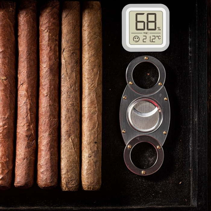 Тоді все, що потрібно, це цифровий термогігрометр: з першого погляду перевірте стан ваших сигар. Температура 18-22 °C і вологість 65-75 % - ідеальні умови для зберігання. Його великий дисплей показує температуру, а також вологість усередині х’юмідору. Ще швидше подивитися на смайлик, що символізує зону кліматичного комфорту: Він усміхається? Ідеально - це означає, що рівень вологості в х’юмідорі правильний. Якщо смайлик робить нейтральне або недружнє лице протягом більш тривалого періоду часу, наприклад, якщо вологість вище 75%, слід вжити заходів.