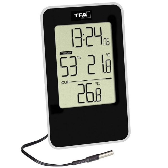 За допомогою цього функціонального термогігрометра ви можете одночасно стежити за кліматом у приміщенні, температурою зовнішнього повітря і часом.