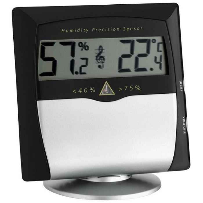 Хороший клімат в приміщенні важливий не тільки для людей. Навіть музичні інструменти потребують правильних кліматичних умовах. Основним матеріалом багатьох інструментів, таких як піаніно, скрипка, гітара або фагот, є дерево - гігроскопічний матеріал, чутливий до коливань вологості. При високій вологості деревина вбирає вологу і набухає. З іншого боку, якщо навколишнє повітря дуже сухе, з дерева видаляється волога. Результат: музичні інструменти деформуються, отримує пошкодження фарба, утворюються тріщини і якість звуку погіршується. Також може виникнути серйозний збиток, пов'язаний з високими витратами на ремонт. Щоб захистити ваші музичні інструменти, TFA розробила цифровий термогігрометр "MUSICONTROL". Температуру і вологість в приміщенні можна легко контролювати і регулювати. Якщо вологість становить від 45% до 65%, на дисплеї з'явиться ключ як індикатор ідеальних умов зберігання. В іншому випадку пристрій сигналізує за допомогою функції візуального та звукового попередження. Ви також можете викликати збережені максимальні і мінімальні значення натисканням кнопки і відстежувати коливання температури і вологості.