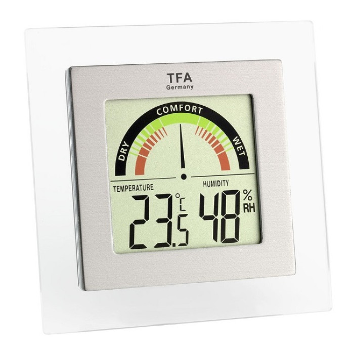 Принаймні дві третини життя людини проводяться в приміщенні. Чи відчуваємо ми себе добре і комфортно вдома, багато в чому залежить від якості повітря в приміщенні. У занадто вологих приміщеннях зростає цвіль, але надмірно сухе повітря може завдати шкоди нашому здоров'ю, а також постраждають домашні тварини, рослини, дерев'яні підлоги і антикварні меблі. За допомогою цього термогігрометра ви можете легко стежити за температурою і вологістю і регулювати її за допомогою цілеспрямованого обігріву та вентиляції. Це створює приємне і здорове середовище проживання і навіть економить витрати на опалення. Кольорові зони рівня комфорту показують, чи є повітря в приміщенні ідеальним, занадто вологим або надмірно сухим. Найвищі і найнижчі значення зберігаються і відображаються при натисканні на кнопку.