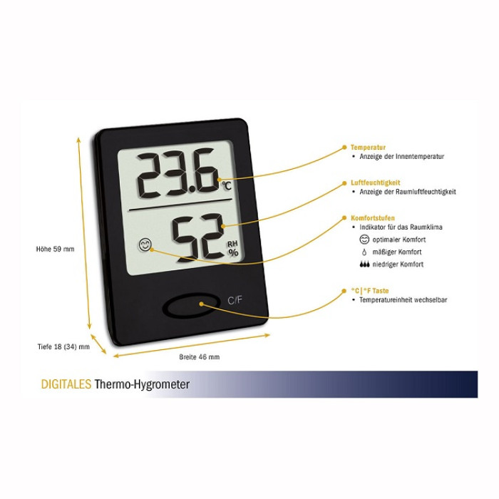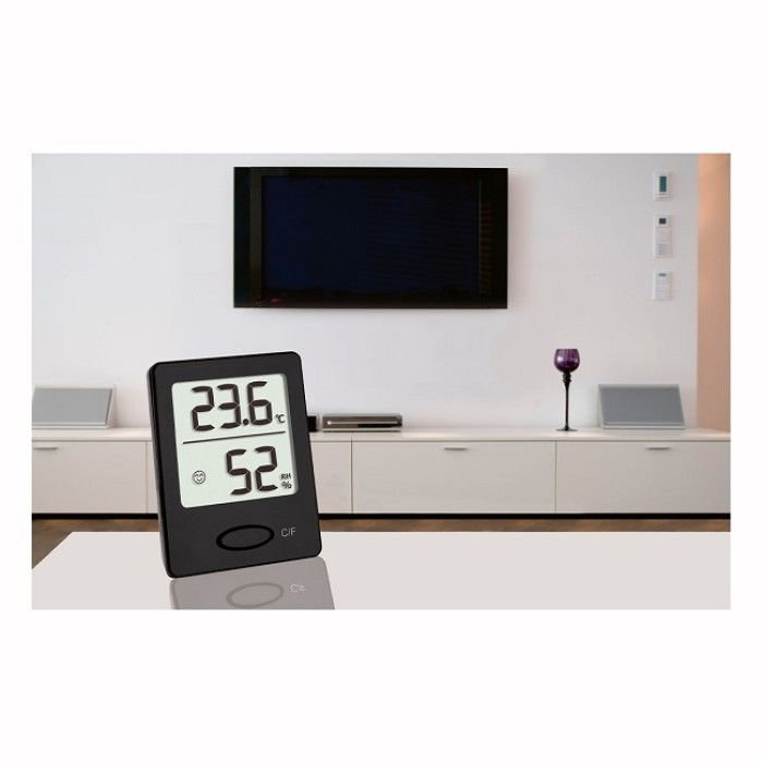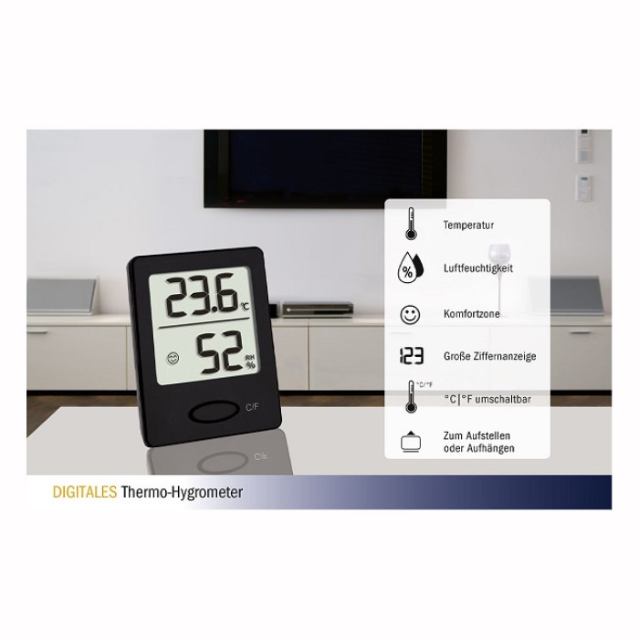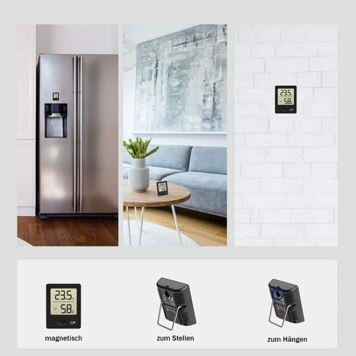 Чи відчуваємо ми себе добре і комфортно вдома, багато в чому залежить від якості повітря в приміщенні. У занадто вологих приміщеннях зростає цвіль, але надмірно сухе повітря може завдати шкоди нашому здоров'ю, а також постраждають домашні тварини, рослини, дерев'яні підлоги і антикварні меблі. Цей термогігрометр є ідеальним вимірювальним приладом для моніторингу клімату в приміщенні. Ви можете легко стежити за температурою і вологістю і регулювати їх за допомогою цільового опалення та вентиляції, коли значення знаходяться за межами зони комфортного рівня. Якщо з'являється значок смайлика, значення є ідеальними. Це створює приємне і здорове середовище проживання і навіть економить витрати на опалення. Практичний магніт дозволяє легко прикріпити термогігрометр до металевих поверхонь.