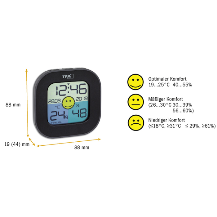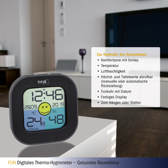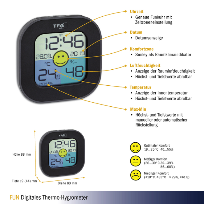 Якщо жовтий смайлик посміхається вам променистою усмішкою на веселому барвистому термогігрометрі FUN, значить клімат у ваших кімнатах ідеальний. З цифровим вимірювальним приладом від TFA Dostmann ви завжди можете бачити температуру і вологість у приміщенні і можете підтримувати значення в межах зони комфорту за допомогою цільового обігріву та вентиляції. Таким чином, ви створюєте приємне і здорове середовище проживання і навіть економите на витратах на опалення. Щоденні максимальні і мінімальні значення можуть бути викликані натисканням кнопки. Пікові значення автоматично скидаються через 24 години або можуть бути скинуті вручну в будь-який час за вашим вибором. Час і дата оновлюються за допомогою високоточного DCF77-радіосигналу.