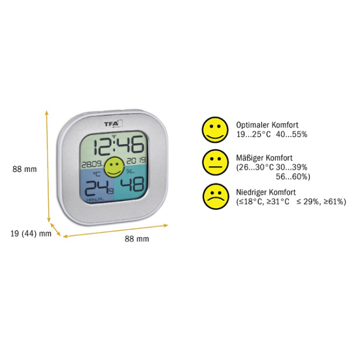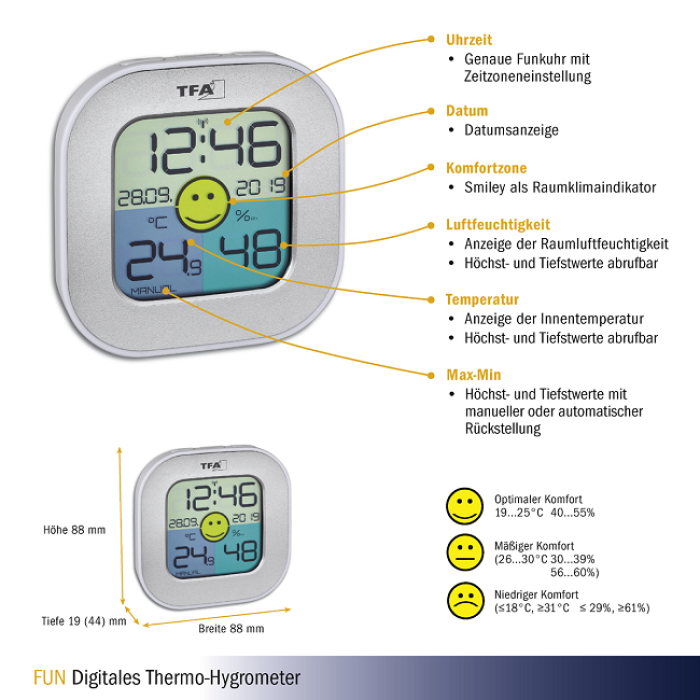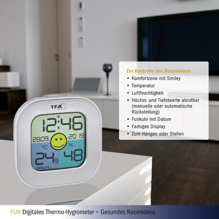 Якщо жовтий смайлик посміхається вам променистою усмішкою на веселому барвистому термогігрометрі FUN, значить клімат у ваших кімнатах ідеальний. З цифровим вимірювальним приладом від TFA Dostmann ви завжди можете бачити температуру і вологість у приміщенні і можете підтримувати значення в межах зони комфорту за допомогою цільового обігріву та вентиляції. Таким чином, ви створюєте приємне і здорове середовище проживання і навіть економите на витратах на опалення. Щоденні максимальні і мінімальні значення можуть бути викликані натисканням кнопки. Пікові значення автоматично скидаються через 24 години або можуть бути скинуті вручну в будь-який час за вашим вибором. Час і дата оновлюються за допомогою високоточного DCF77-радіосигналу.