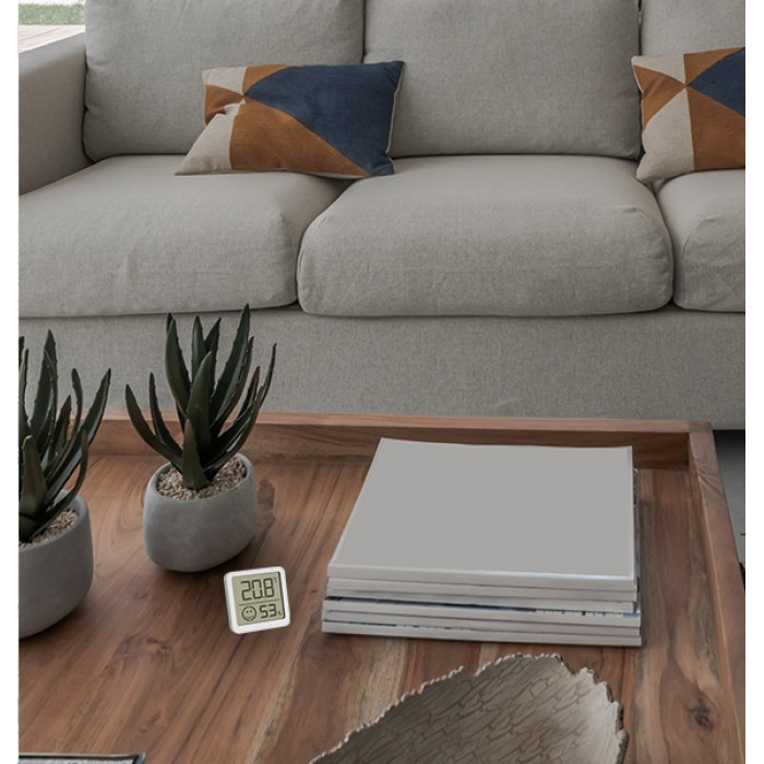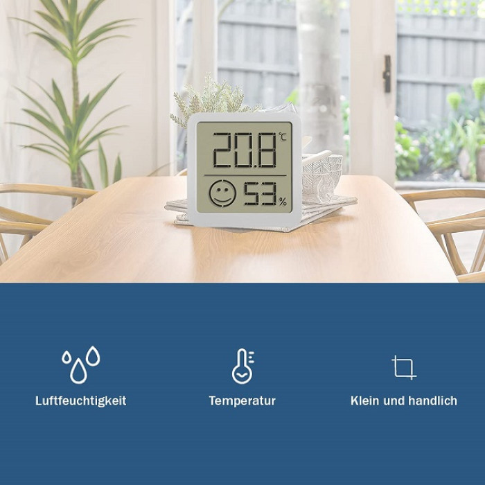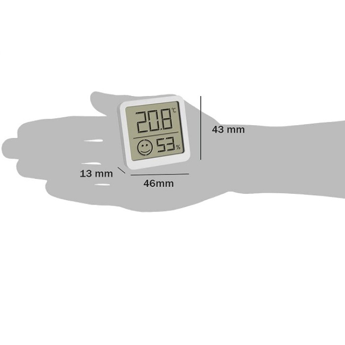 Компактний пристрій розміром 46 x 43 мм не займає багато місця, а завдяки вазі всього 25 грамів його можна легко прикріпити до багатьох поверхонь за допомогою клейкої підкладки. Крім того, ви можете використовувати підставку, що входить до комплекту постачання, бажано в центрі кімнати, оскільки розташування безпосередньо біля вікна або біля обігрівача може призвести до спотворення показників. Термогігрометр працює від батарейки CR2032 (входить до комплекту).
