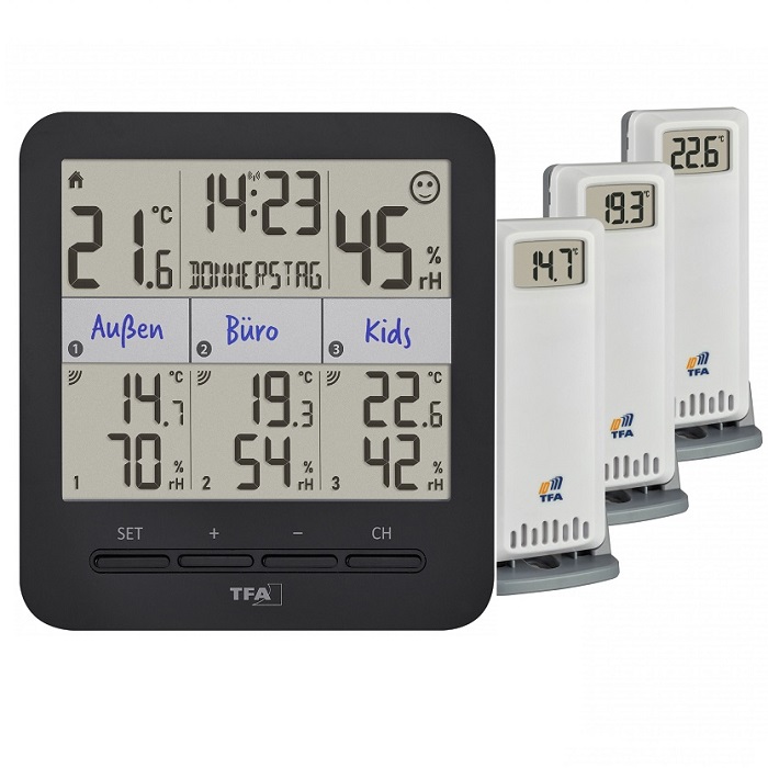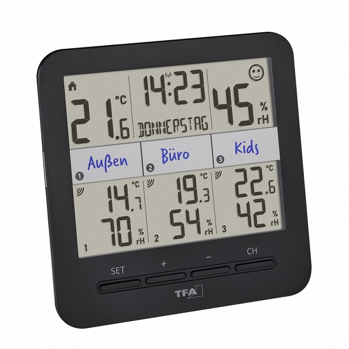 Завдяки максимальному радіусу дії 100 метрів цей радіопередавач також можна встановити на відкритому повітрі та надавати важливі дані щодо поточного зовнішнього клімату. Усі точки вимірювання, що контролюються, можуть бути окремо позначені на станції, що полегшує їх читання. Точний час з точністю до секунди встановлюється автоматично по радіосигналу, доповнюється повною датою або днем тижня.