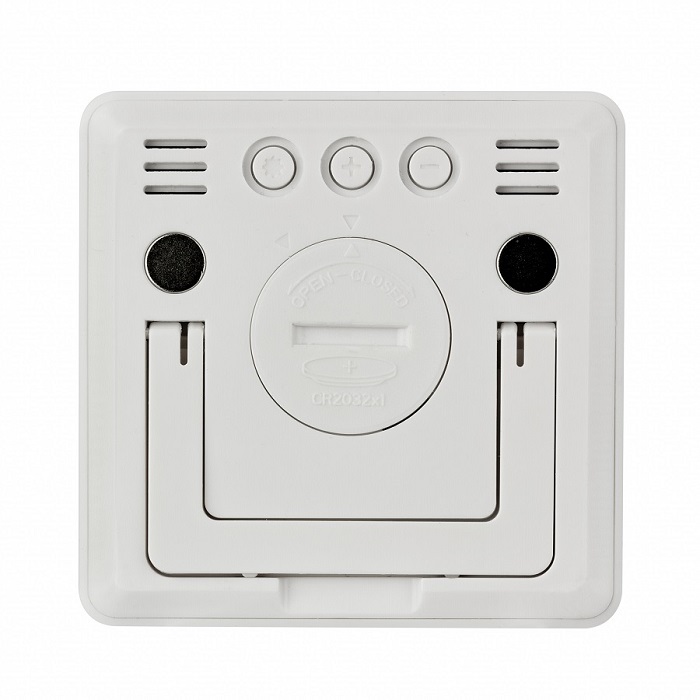 Термогігрометр можна прикріпити до металевих поверхонь за допомогою двох маленьких магнітів з тильного боку корпусу або встановити на горизонтальній поверхні за допомогою відкидної підставки.